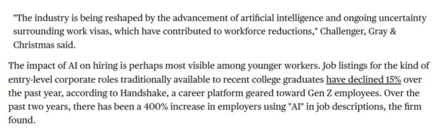 报告分析,人工智能的快速进步与工作签证政策的不确定性,正在重塑就业格局。其中,年轻求职者首当其冲。过去一年,美国企业面向应届毕业生的初级职位招聘量下降15%,而招聘要求中提及“人工智能”的岗位数量却激增400%,凸显技能需求结构性转变。