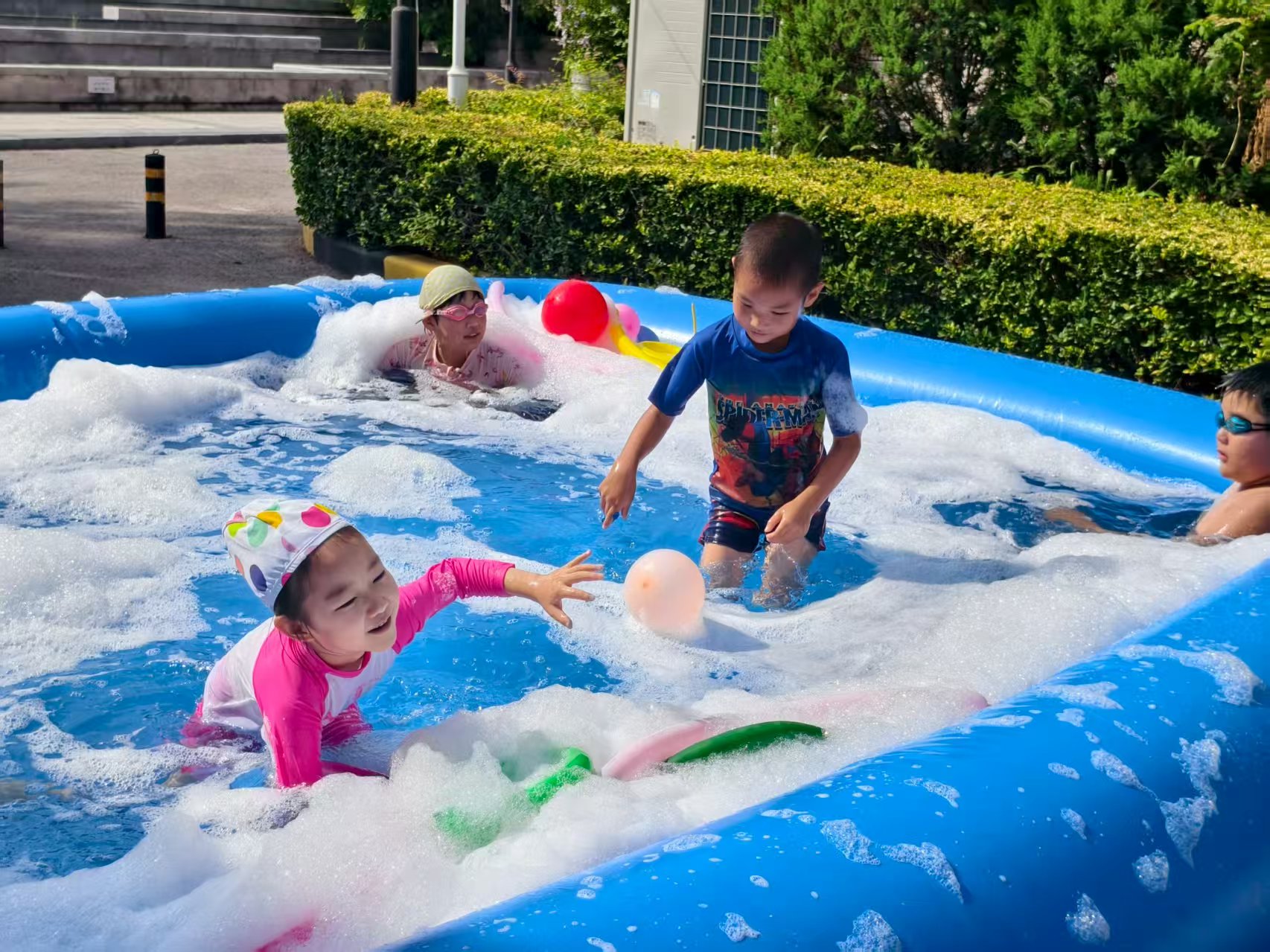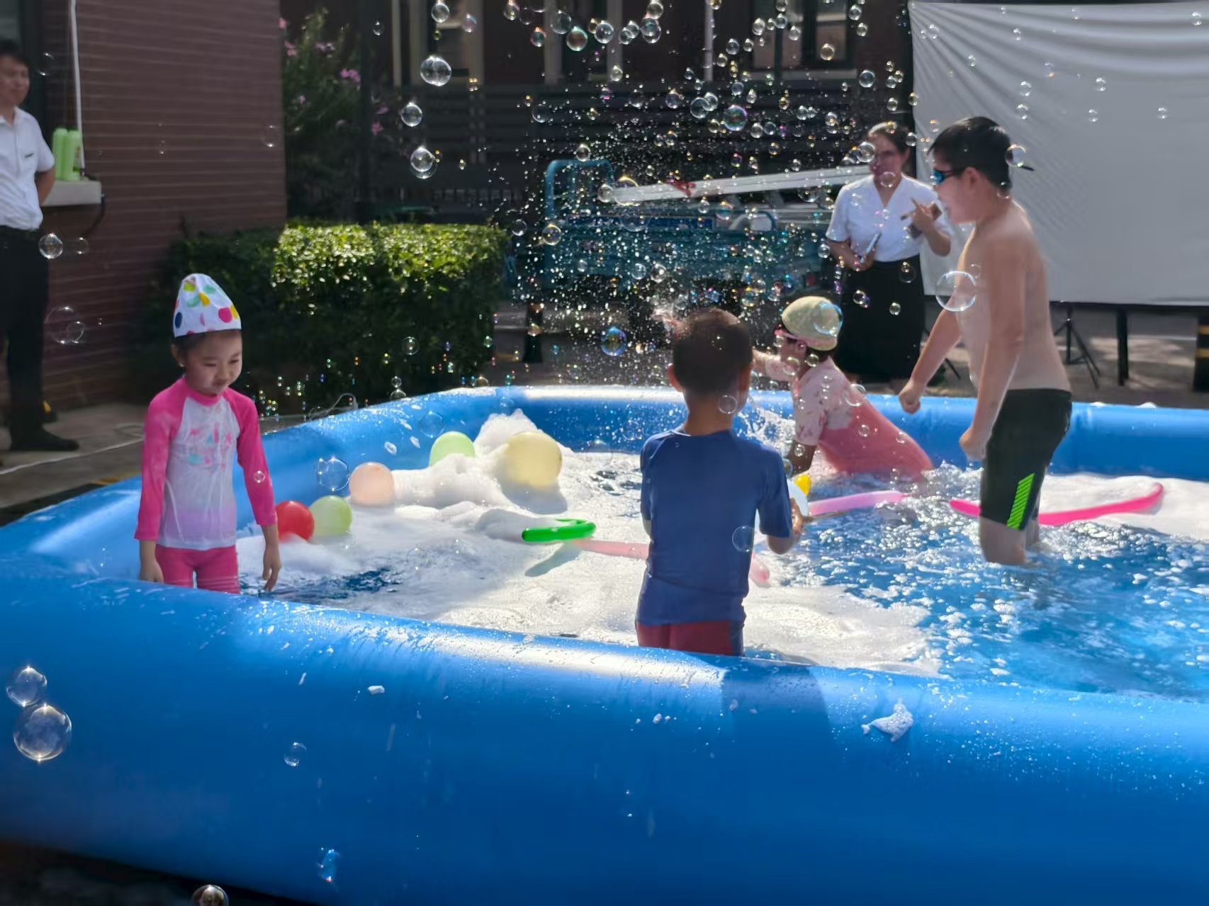 活动伊始,社区工作人员向在场居民和孩子们发出“当好上合东道主 争做文明有礼天津人”倡议,通过生动案例讲解文明礼仪规范和文明旅游常识,引导大家从自身做起,在日常生活中践行文明行为,共同维护社区和谐环境。活动现场,充气泳池成为孩子们的欢乐天地。联发物业工作人员操控泡泡机,源源不断的泡沫如雪花般飘落,孩子们在泡沫中追逐嬉戏、泼水玩耍,笑声此起彼伏。与此同时,透明的泡泡在阳光折射下五彩斑斓,孩子们伸手触碰的瞬间,仿佛置身梦幻童话世界,家长们则用镜头记录下这温馨时刻。