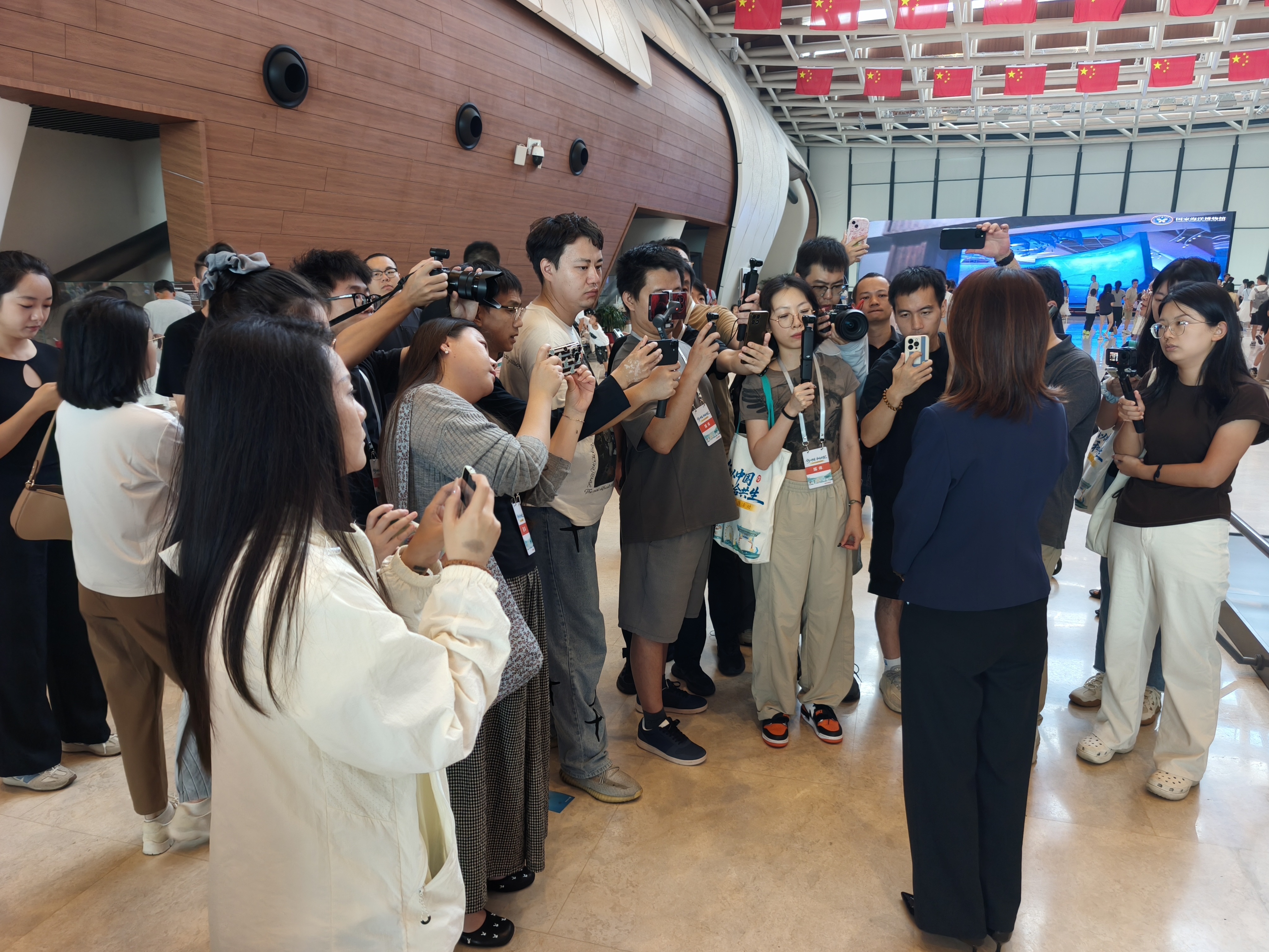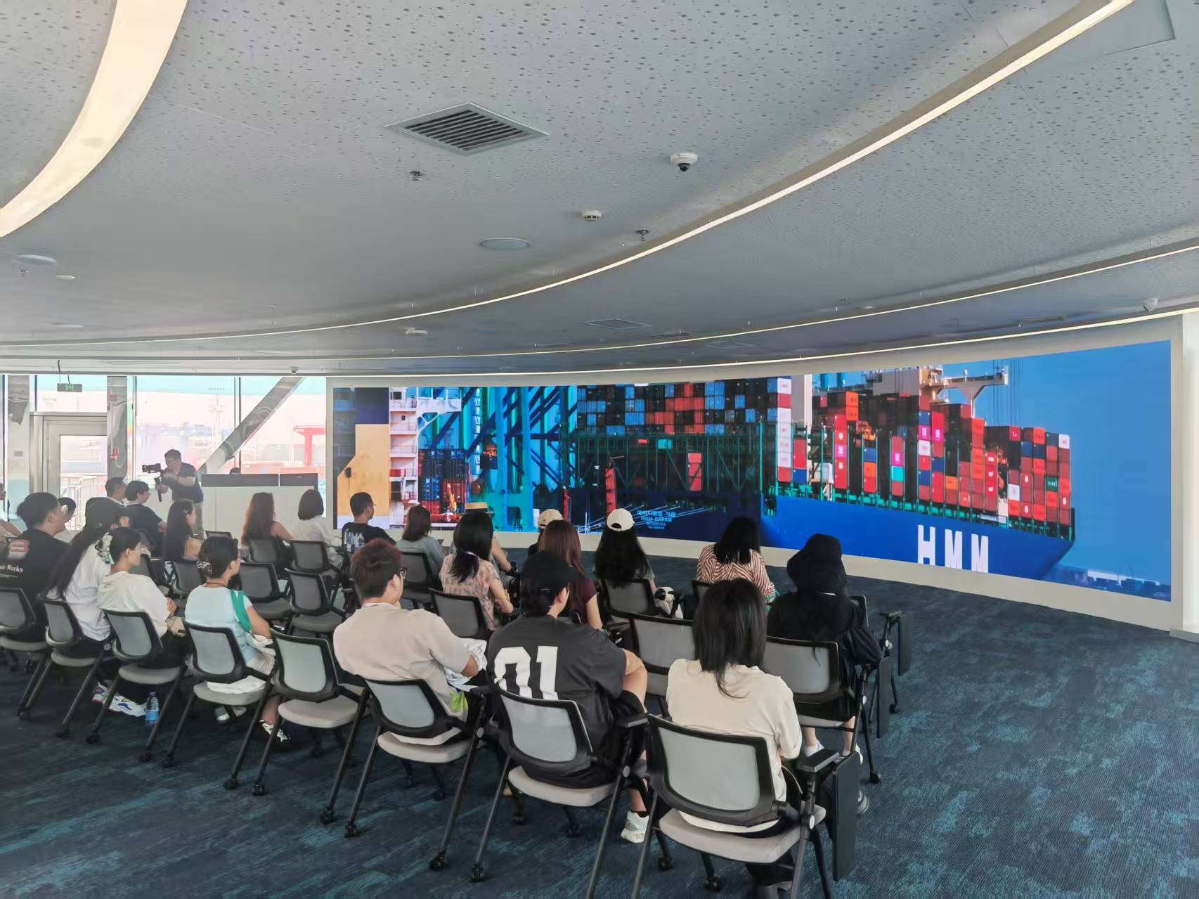 媒体团站在码头观景平台俯瞰,“七彩码头”尽收眼底,自动化岸桥挥舞巨臂,精准装卸集装箱;蓝色的智能拖车往来穿梭,它们搭载无人驾驶技术,按照智能水平运输系统指令,高效完成运输任务。“这些智能设备太先进了,极大提高了港口作业效率。”媒体团成员们对眼前的智慧化场景赞叹不已。