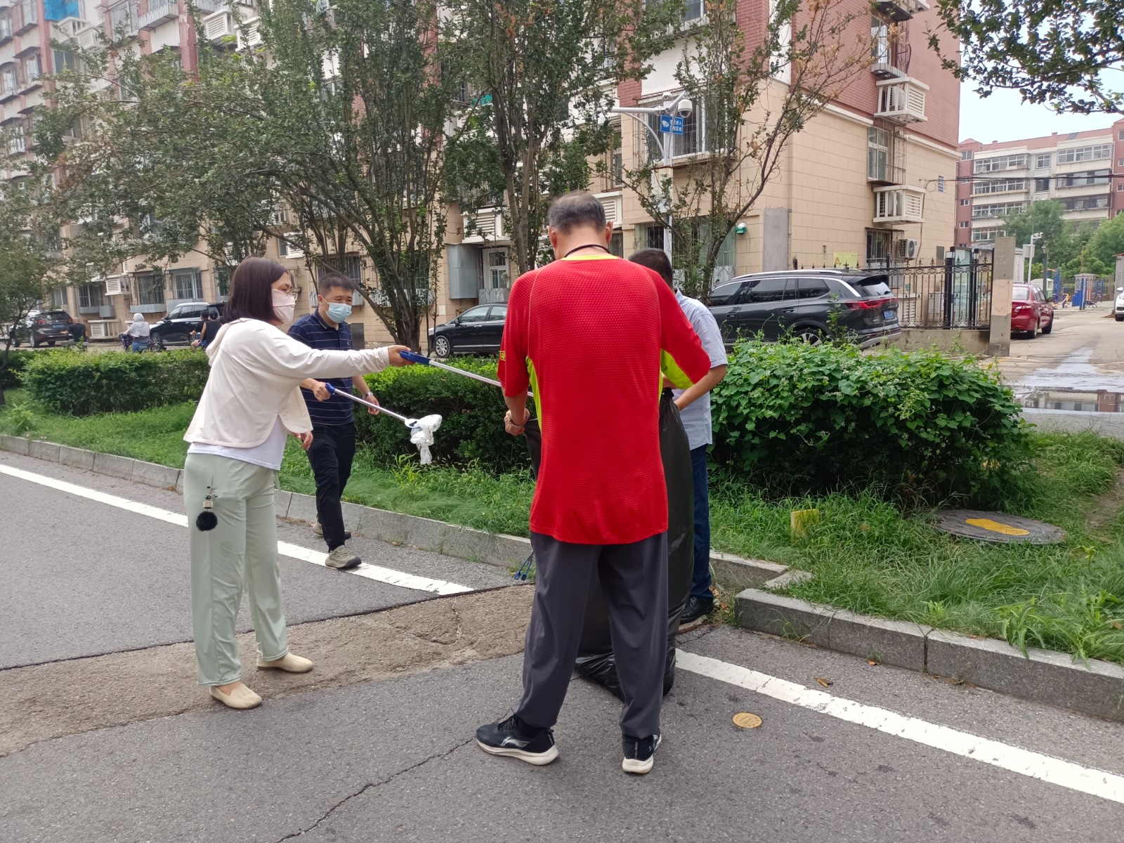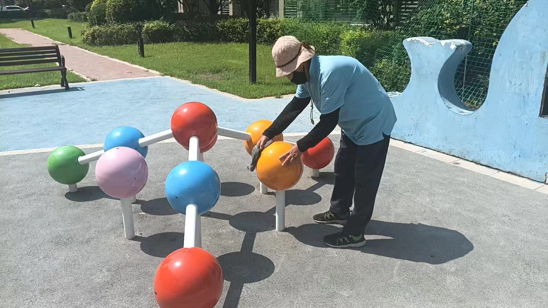 在王园里社区,志愿者们用扫帚、铲刀给小区“深度美容”。绿化带里的烟头、楼道拐角的“僵尸包装盒”被逐一清理,连健身器材的螺丝缝都有人用牙刷沾洗洁精刷洗。