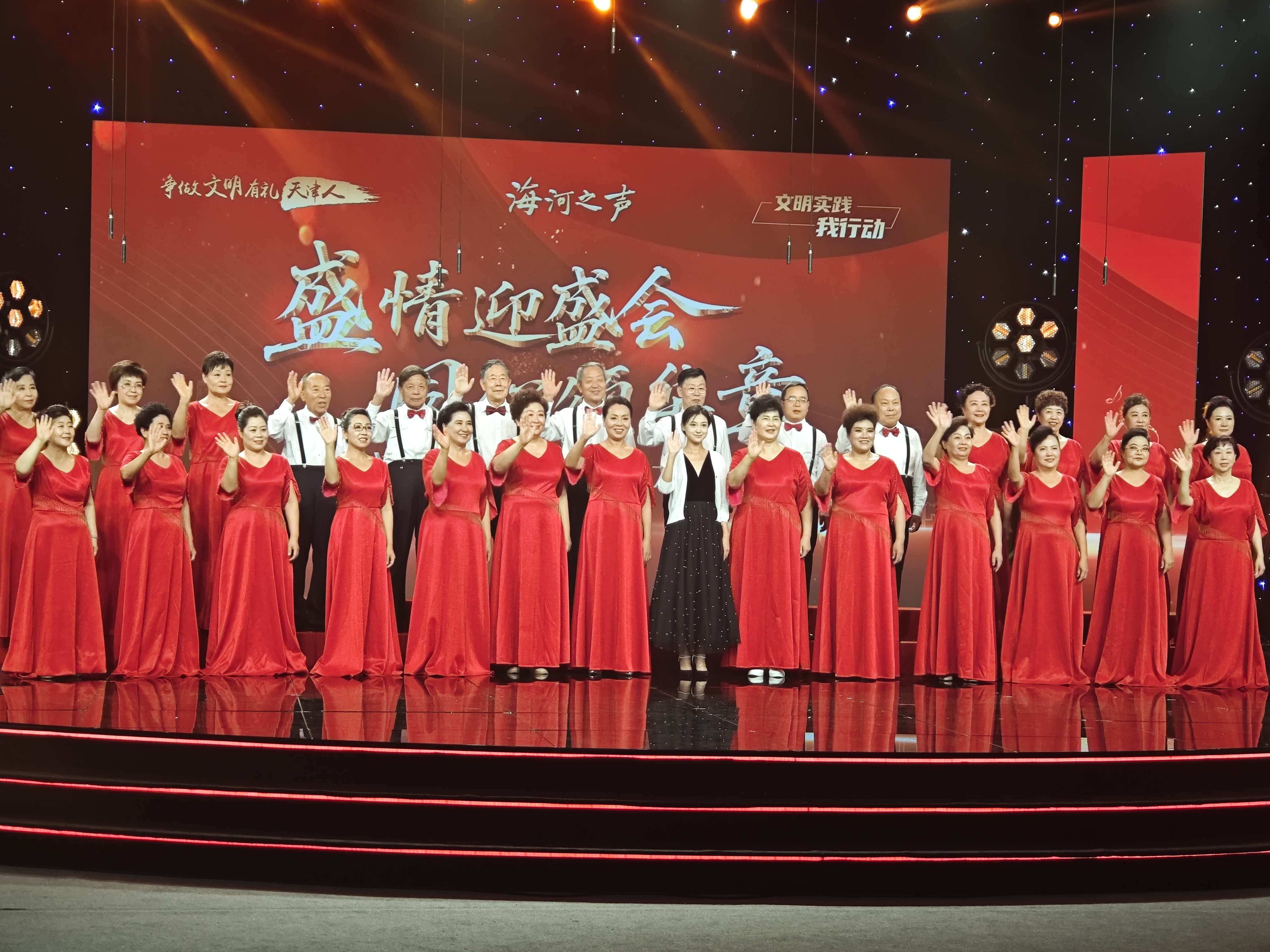“请介绍一下你们的团队。”主持人微笑着递过话筒,队长陈阿姨从容应答:“我们是新北街道欧美小镇社区魅力合唱队,是社区牵头组建的文艺团体,队员都是社区里热爱文化生活的退休长者。作为社区文化名片,我们用合唱串联邻里情,传递和谐暖意,鲜活展现滨城社区居民退休不褪色,依然满怀对生活的热忱与对盛会的期盼。今天,我们这支社区‘银发合唱团’代表滨海新区的社区力量参赛,要用和声唱响社区风采,礼赞时代盛会!”