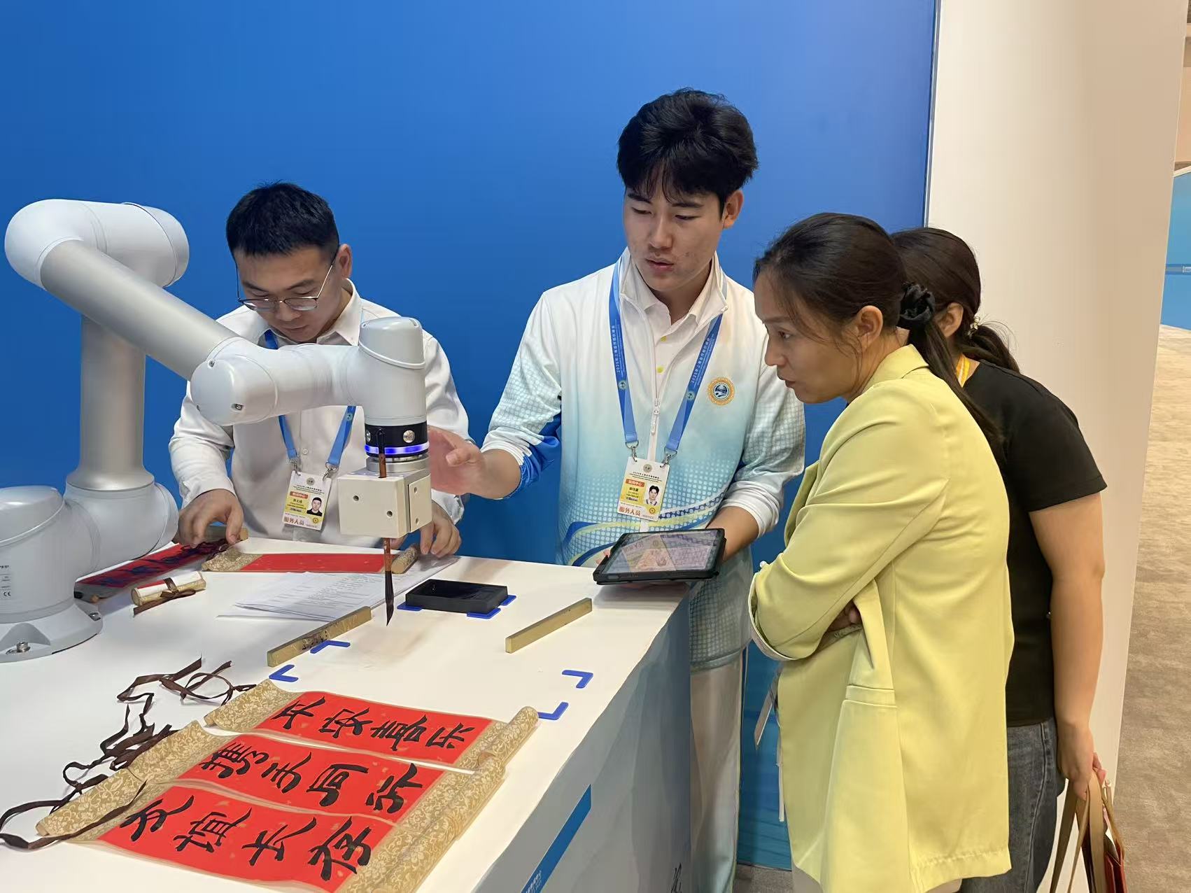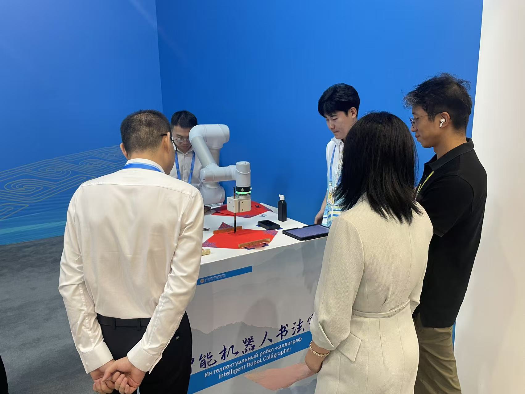 “May I have a try?”在智能机器人书法家展区,一位来自巴基斯坦的记者对机器人“写书法”展现了浓厚兴趣。现场工作人员介绍,智能机器人书法家由新松机器人设计,能根据自有数据库中的文字内容,一笔一划进行书法写作。