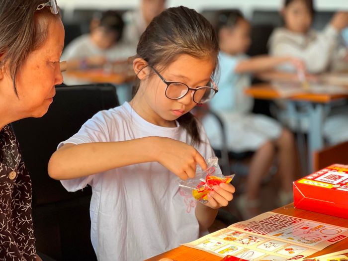 花灯制作完成后,猜灯谜互动环节拉开帷幕。活动现场挂满了写有灯谜的纸条,家长和孩子一起认真思考、热烈讨论,齐心协力破解谜题。每当成功猜对一个灯谜,大家都会兴奋地去兑换中秋小礼品——文具套盒,小小的礼品不仅带来了喜悦,更增进了亲子间的互动乐趣。