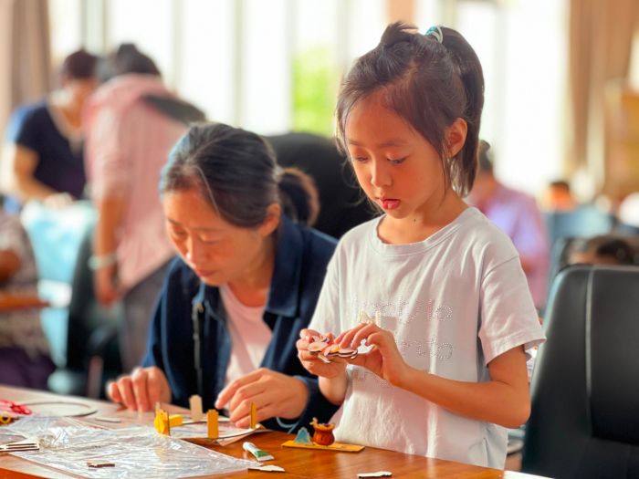 最受期待的亲子花灯制作环节紧随其后。工作人员为每个家庭分发了灯笼骨架、彩纸、胶水、丝带等制作材料,耐心演示了花灯的制作步骤。拿到材料后,家长和孩子迅速投入创作,有的家庭一起裁剪彩纸,有的专注地粘贴装饰,有的精心系上丝带,大家分工协作,其乐融融。其间,工作人员在现场巡回指导,及时帮助解决制作过程中遇到的问题,并提醒孩子们注意安全使用工具,确保每个家庭都能顺利完成属于自己的中秋花灯。