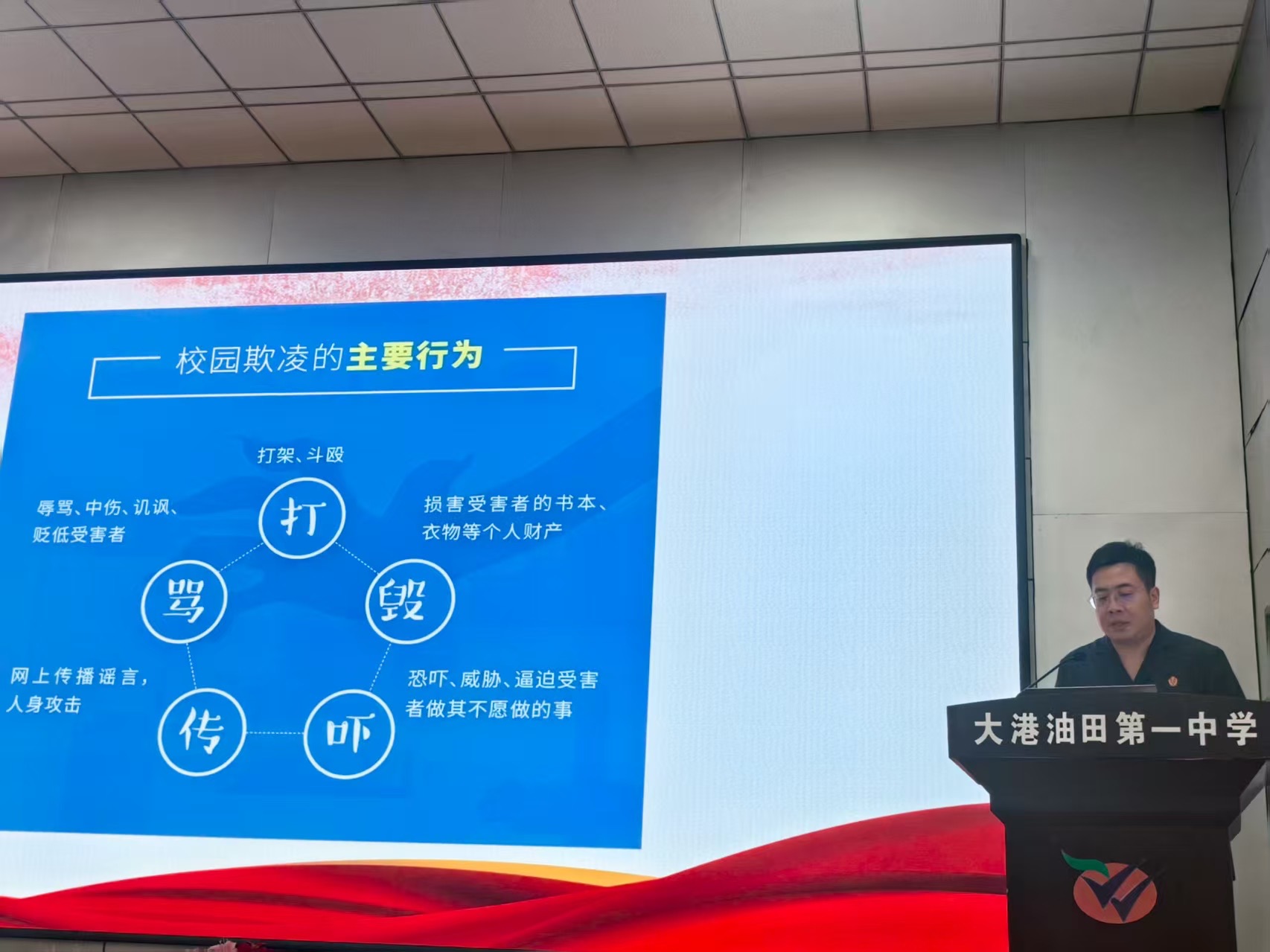 津滨网讯(记者 张爱萌)为帮助学生认清校园欺凌的危害,树立法治意识,掌握自我保护技能,巩固提升“双创零”成果,近日,滨海新区南部区域关工委精心安排天津市第三中级人民法院“红色小法徽”志愿服务队走进大港油田第一中学,进行了一场详实生动、直击人心的防治校园欺凌专题公益讲座活动。