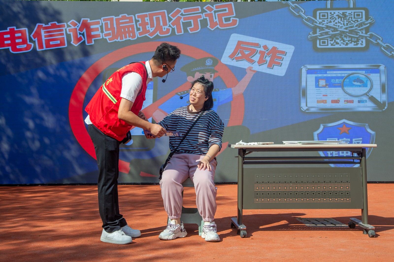 活动正式开始前,现场已是人头攒动,气氛热烈。由文艺志愿者组成的打鼓队气势恢宏,秧歌舞队步伐欢快,迅速聚集了人气。“这鼓敲得真带劲儿,节日气氛一下子就上来了!”带着孙子前来参加活动的王大爷笑着说。现场电子大屏循环播放的反诈、消防、交通安全等公益短视频,以生动案例向等候的居民普及防范知识和应急技巧,为活动进行了有效预热。正在观看视频的李阿姨表示:“这些小视频拍得明白,像怎么防诈骗、着火怎么跑,一看就懂,对我们老年人特别有用。”