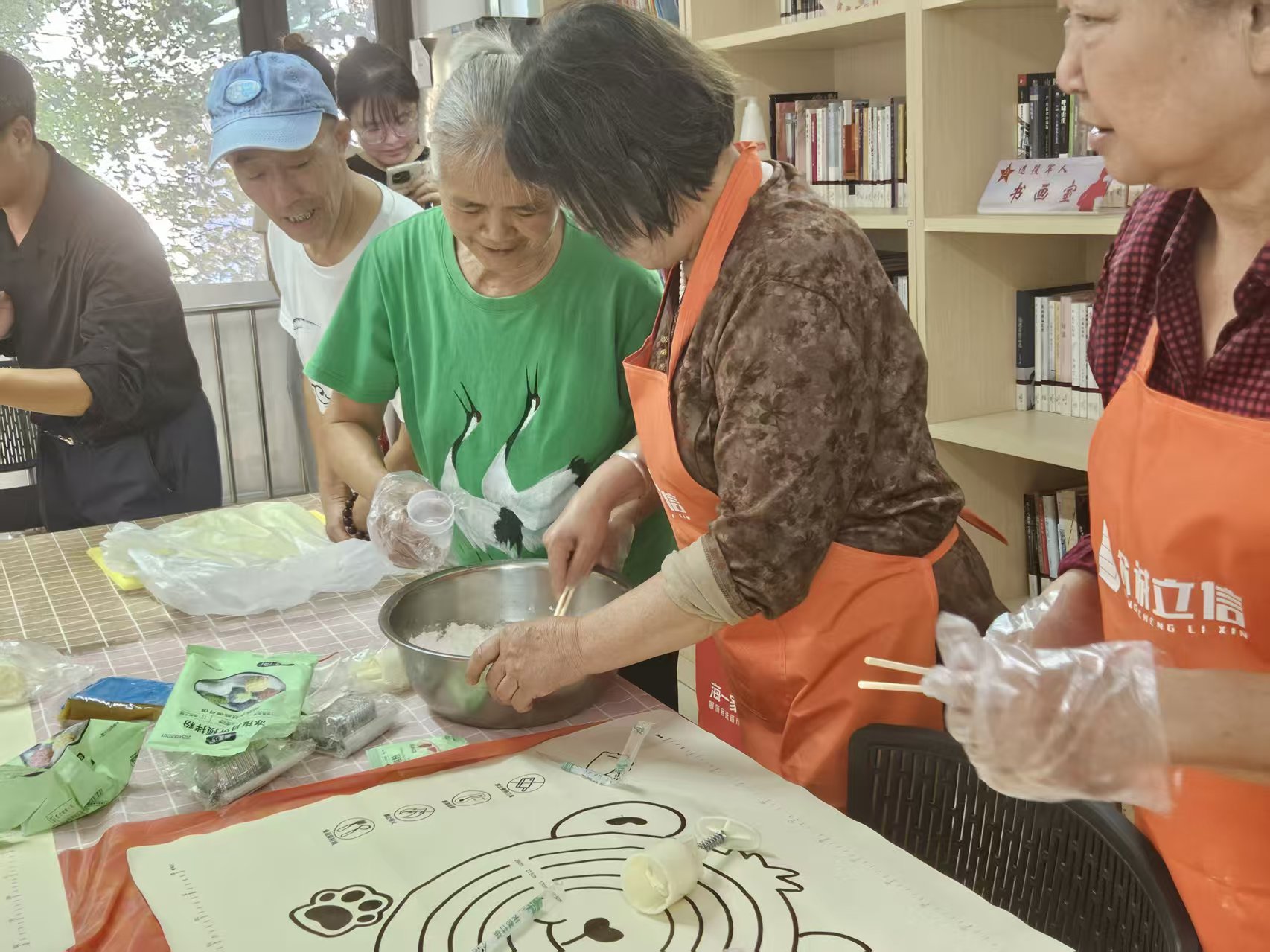 活动现场欢声笑语,其乐融融,大家围成一桌,社区志愿者为居民们讲解家风家训知识,分享中秋节文化。随后大家戴上手套,在志愿者老师的指导下,和面、称重、包馅、压模、烘烤……有条不紊地进行月饼制作。不一会儿,一个个精致的月饼呈现于眼前,看着象征着团圆的月饼整整齐齐地摆放在大家面前,每个人脸上都洋溢着幸福的笑容,现场弥漫着月饼的香甜。