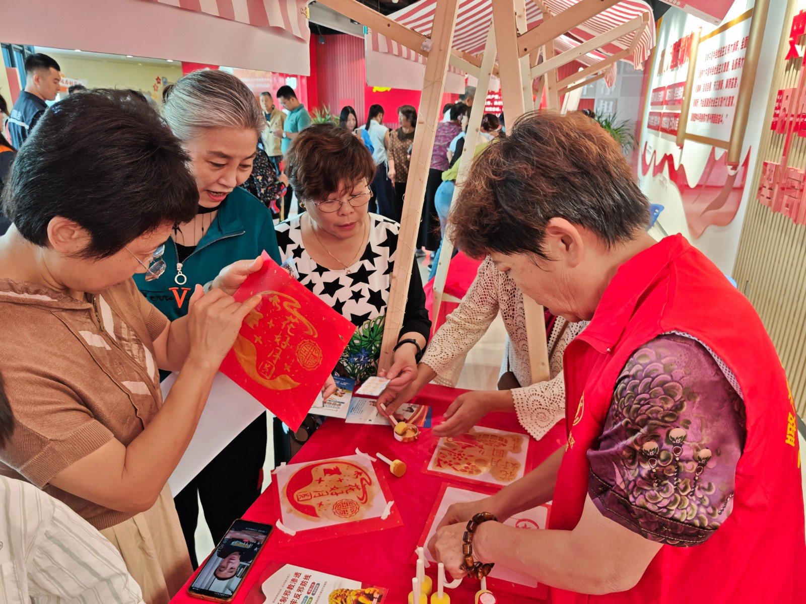 手工制作区是亲子家庭的最爱。手作灯笼摊位前,孩子们在家长的协助下,穿线、粘饰、固定,一步步将零散的材料变成精致的中秋灯笼,点亮对节日的期待;非遗拓印摊位上,居民们手持拓板,轻轻按压间,传统纹样与中秋元素跃然纸上,感受着非遗文化的独特魅力;月饼缝缝乐摊位则充满创意,大家飞针走线,将“月饼”造型的布艺作品缝制完成,既体验了手工乐趣,又收获了专属中秋纪念。