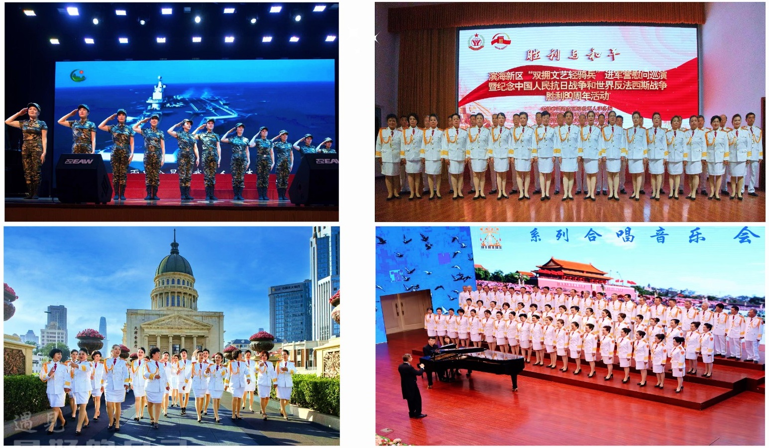 一年来,合唱团以讴歌党、讴歌祖国、讴歌人民和人民军队为宗旨,先后组织参加各类慰问演出活动12场次,他们用歌声传播党和政府对于广大退役军人的关心关爱,唱响新时代,凝聚正能量。为新区“双拥工作”和退役军人事业发展增添了光彩,为丰富广大退役军人的精神文化生活做出了贡献。特别是元旦前市文联、市民政局、海河传媒中心举办的“老爸老妈老牛啦”春节网络电视节目录制、7 月 25日天津港保税区举办的“第五届最美退役军人表彰暨庆祝八一建军节”慰问演出、8月18日新区“双拥文艺轻骑兵进军营慰问巡演”活动、9月9日天津市“第21届城市之光音乐会”、9月18日“滨海新区纪念中国人民抗日战争暨世界反法西斯战争胜利80周年”群众演唱会和9月28日天津市军休系统“纪念中国人民抗日战争暨世界反法西斯战争胜利 80 周年”演唱会等重大演出活动中,合唱团均以嘹亮的歌声、饱满的精神、严整的军容、优良的作风赢得了业内专家的高度评价,受到部队官兵和退役军人的广泛赞誉。合唱团用音乐传递了退役军人的风采与情怀,用合唱的力量和艺术感染力引领群众。退役军人合唱团以歌为媒,以情为纽带,秉承退役军人“退役不褪色”的优良传统,在艺术追求与精神传承的道路上迈出了坚实而有力的步伐。
