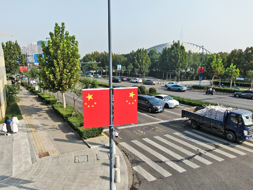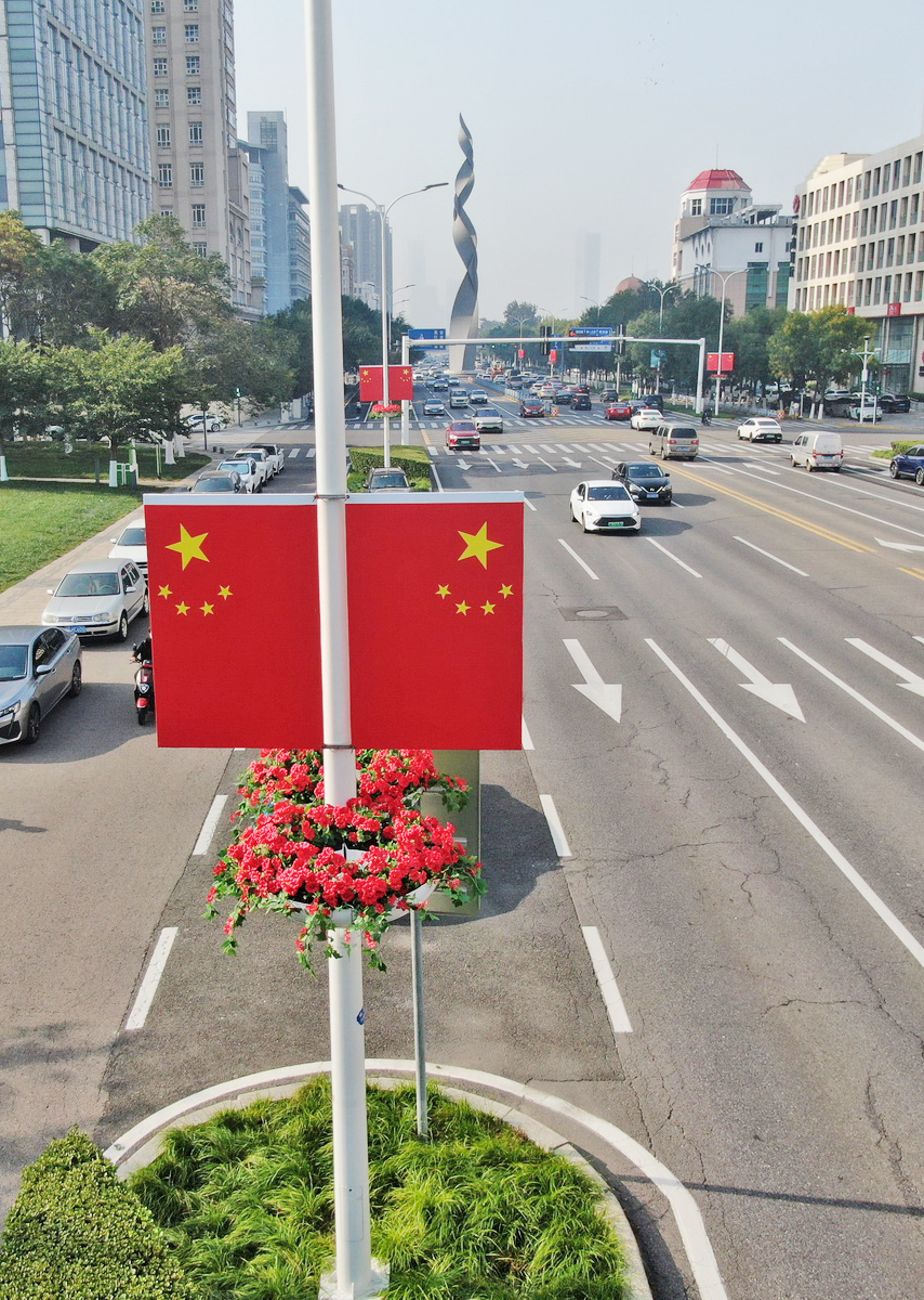 津滨网讯(记者 贾磊 摄影报道)9月30日,滨海新区南海路、中央大道、新港二号路、融义路等主干道已焕新,崭新国旗沿道路两侧有序悬挂,与“中国梦”主题灯箱交相辉映,提前点燃国庆氛围 。