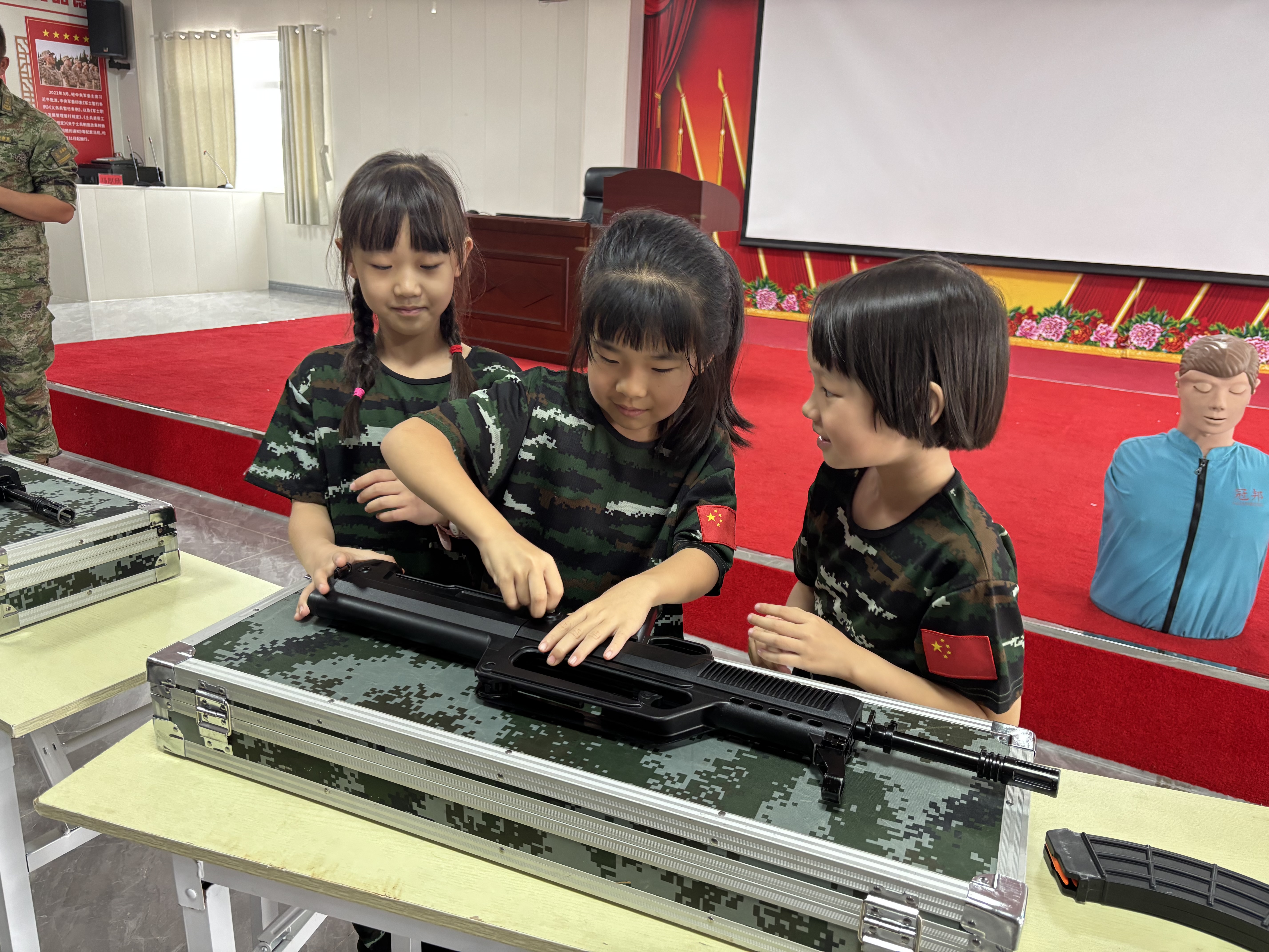 在军事技能体验环节,教官细致地讲解了枪械知识与战术动作,学员们手握模拟训练器械,感受到了保家卫国的责任与使命,特别是“武器分解结合”项目,更锻炼了他们的耐心、细心与动手能力。现场,教官还给孩子们传授了应急救护知识,让孩子们在实操中掌握了实用急救技能,树立起“安全第一、自救互救”的意识。