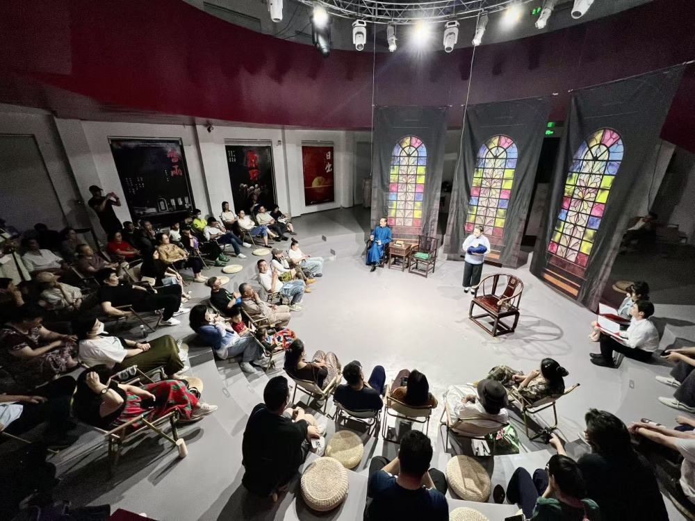 夜幕降临,天津市河北区天美艺术街区的圆厅剧场灯光渐亮,曹禺的经典剧目正在上演。剧场环形布局让观众与演员“零距离”,布景、道具近在眼前——桌上的茶杯、墙上的挂画、演员走动时拂起的衣摆,都让人仿佛置身那个雨夜的客厅。