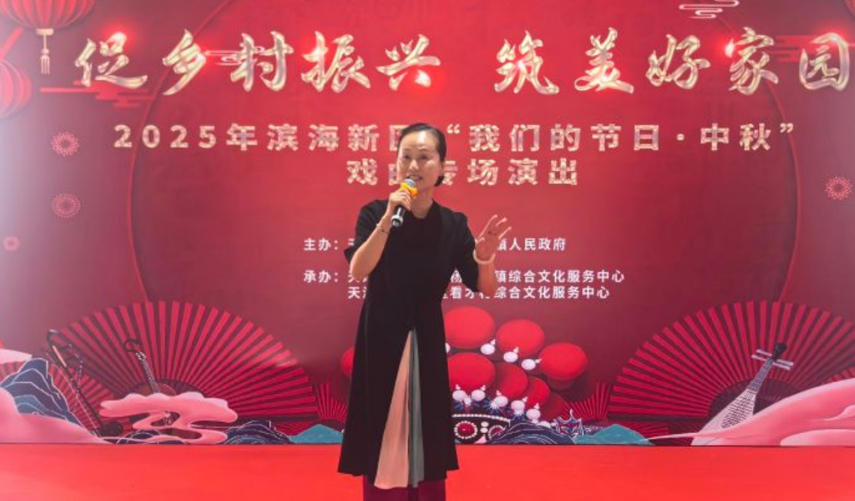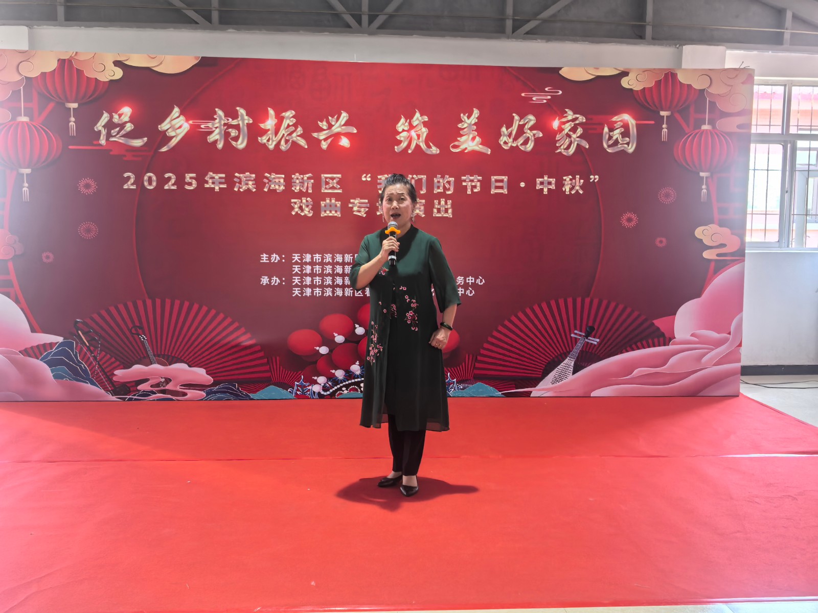 在后台,刚表演完的滨海新区文化志愿者宋海燕告诉记者:“中秋团圆,国庆颂国,戏曲里的家国情怀和节日内涵很契合,能在这样的日子里把传统艺术带给大家,特别有意义。每次下乡演出,看到乡亲们的笑容,我就觉得戏曲有力量。我们不仅是演员,更是乡村振兴的‘文艺轻骑兵’!”