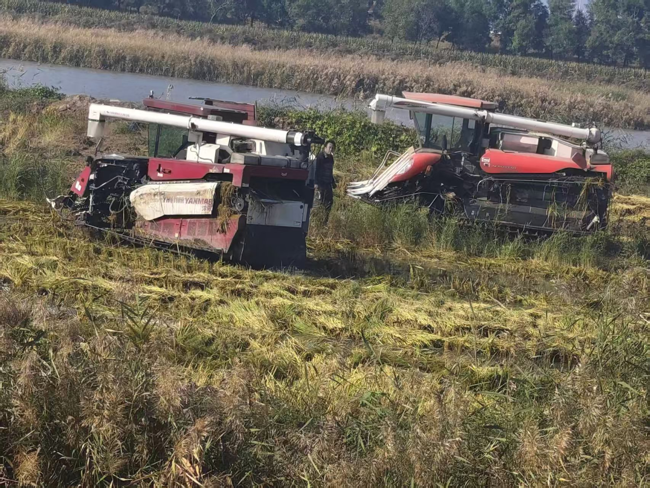 此次分洪预警传来前,太平村400余亩水稻已进入完熟期——金黄的稻穗沉甸甸垂落,饱满的谷粒透着丰收的盼头,原本计划在10月底集中收割。然而,10月12日上午,上游分洪水量骤增,湍急的水流顺着河道漫过田埂,短短几小时内便没过水稻杆下半段。“再不抢收,稻谷泡在水里不出两天就会霉变发芽!”村两委负责人急在心里:“人工收割效率远赶不上洪水上涨速度,唯有动用农机才能争分夺秒。”