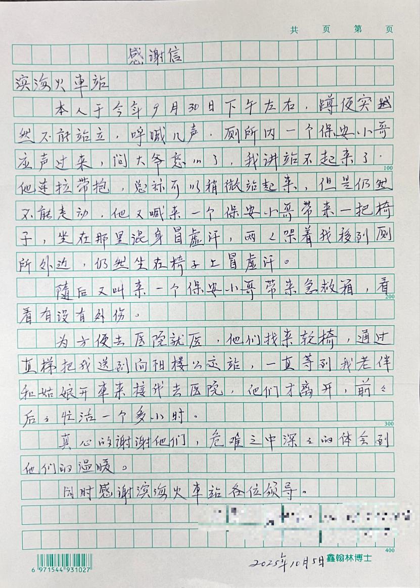 津滨网讯(记者 张伯妍)近日,滨海站收到旅客王先生的手写表扬信,字里行间满是感动——78岁的他在站内突发不适无法站立,安保人员闻声即动:先耐心询问、小心搀扶,再迅速上报调度、联动同事携医药箱驰援,最后用轮椅经无障碍通道,全程护送老人至站外公交站,直至家属接应。这份及时又贴心的守护,不过是滨海站优质服务的一个缩影。