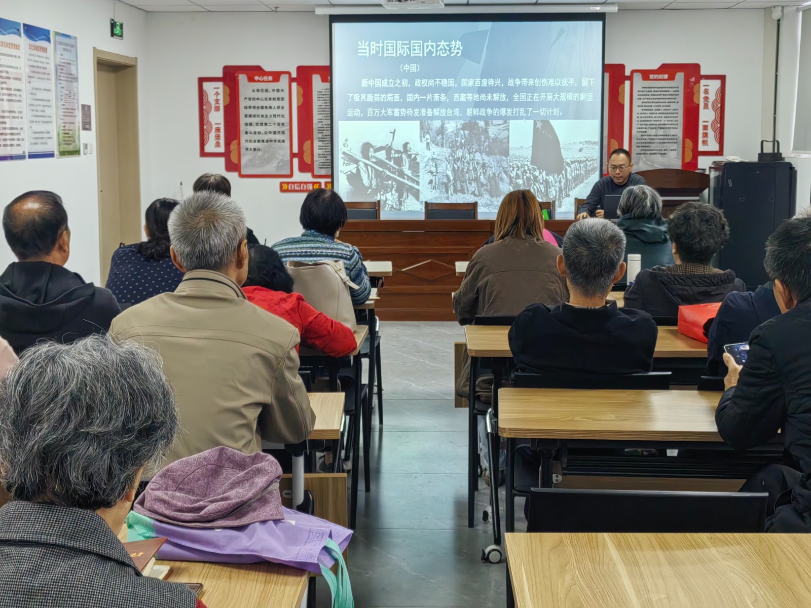 此次讲座的目的在于让辖区居民重温革命历史故事,传承红色基因,弘扬爱国主义精神,增强民族自豪感与凝聚力,激励广大民众为实现中华民族伟大复兴的中国梦贡献力量。活动伊始,社区负责人以“抗美援朝纪念日”为主题开展宣讲。他结合权威史料文献,向大家系统地讲述了抗美援朝战争的国际背景、当时的国内形势以及抗美援朝的五次战役等历史事实,对当时战争的必要性进行了解读。