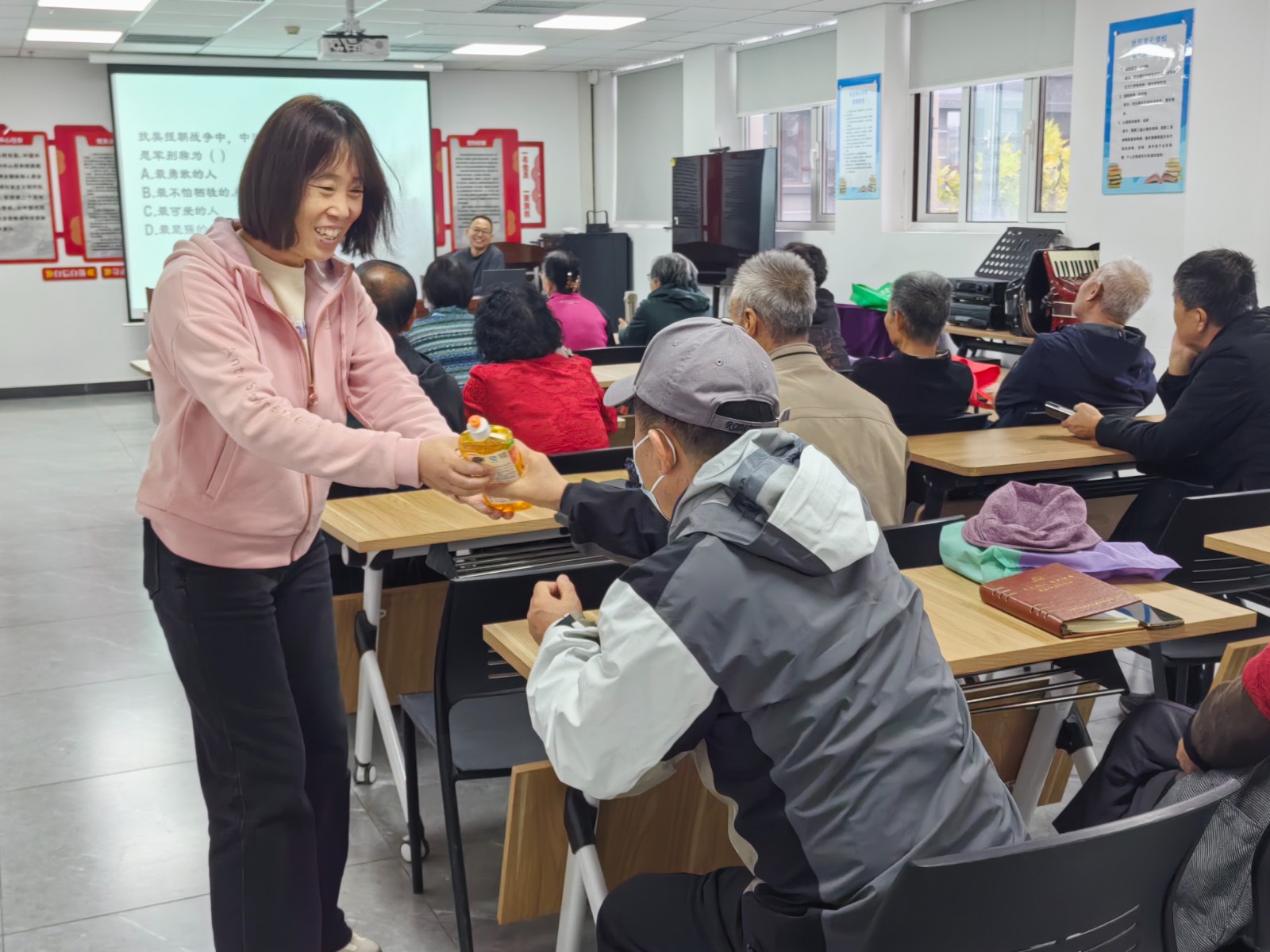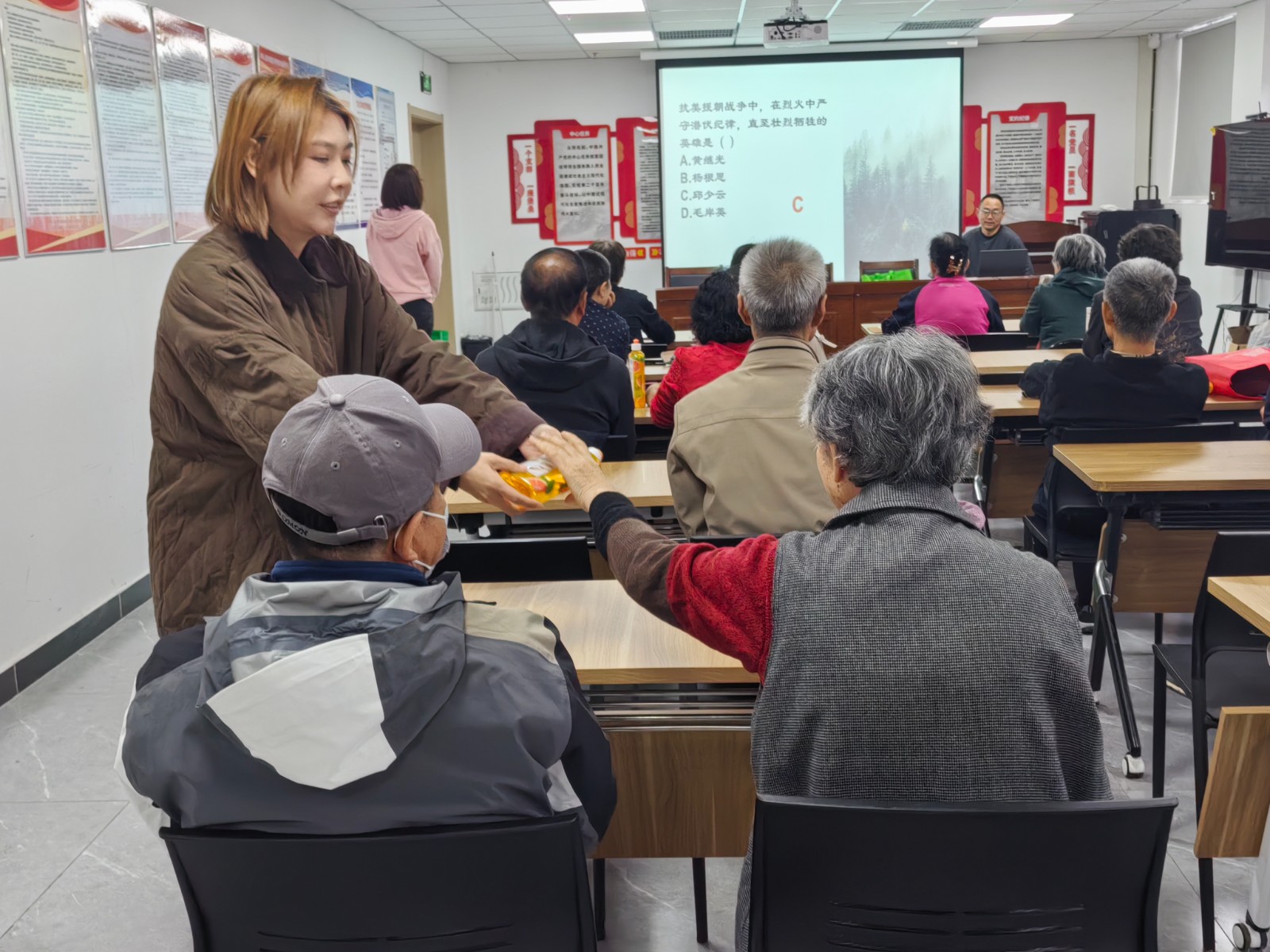 宣讲活动结束后,社区工作人员围绕讲座内容组织了一轮知识抢答竞赛。竞赛题目广泛涉及历史事件、英雄人物事迹、红色文化常识等多个领域。“抗美援朝纪念日是哪一天?”“抗美援朝第一次战役是什么?”随着工作人员逐一抛出问题,现场居民都踊跃举手答题。大家不仅能准确回答问题,还会满怀深情地补充英雄事迹。通过这一互动环节,居民们加深了对红色历史的认知,同时也促进了彼此之间的交流。