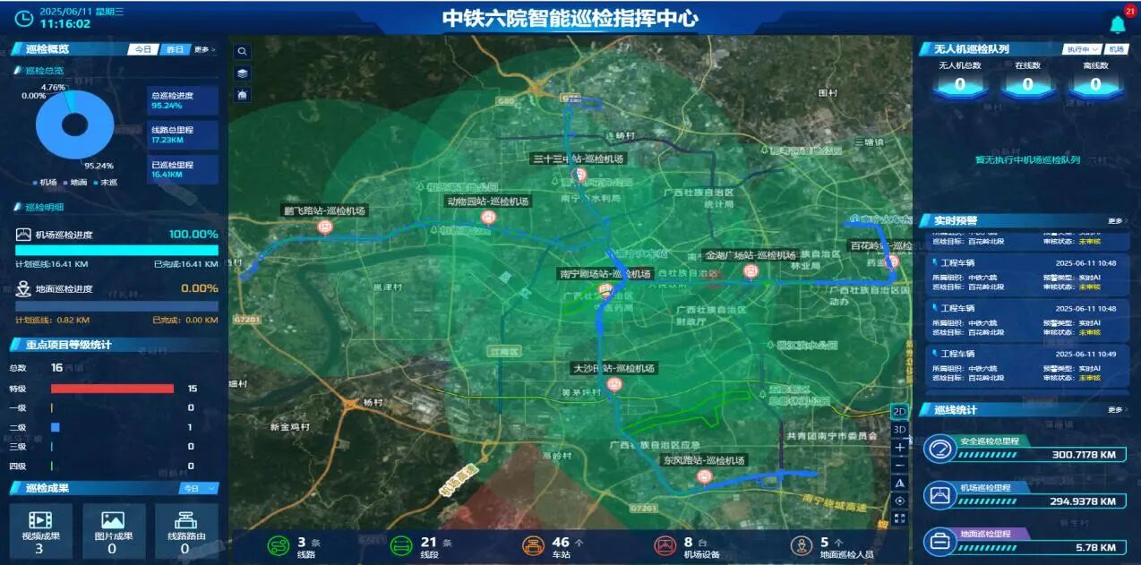 南宁地铁1、2号线总长约60公里,日均客流量超50万人次,其沿线地铁保护区是保障线路安全运营的核心区域。此前,传统人工巡检模式存在明显短板,不仅单次巡检耗时长,还易因地形遮挡、视野局限产生巡检盲区,难以满足高密度运营下的安全防护需求。为破解这一痛点,中铁六院在沿线8个关键点位部署了8台专业巡检无人机,将全线划分为16个标准化巡检区段,实现每日3次全自动巡航作业。