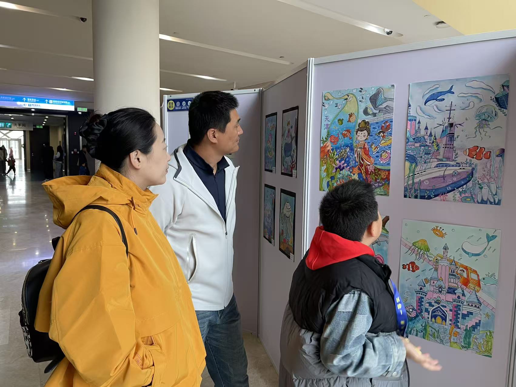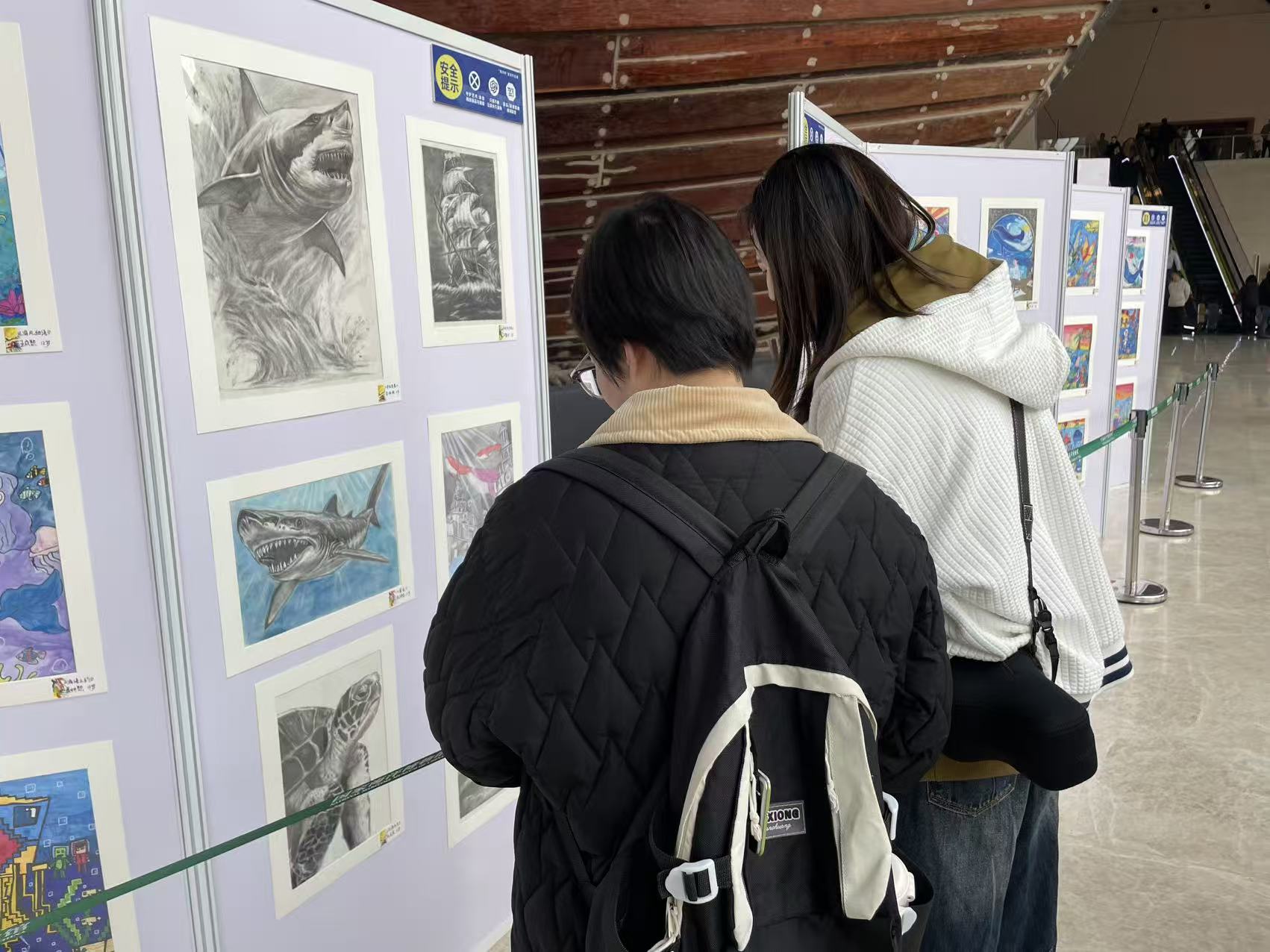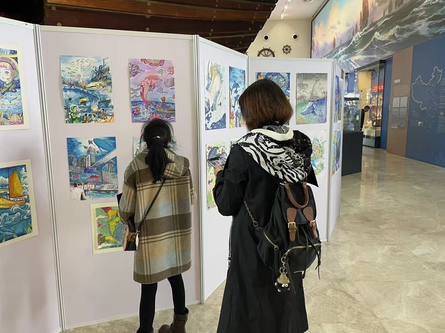 活动现场,大赛为从海量投稿中评选出的特等奖、一等奖、二等奖、三等奖等优秀作品颁奖,激励更多中小学生追求艺术梦想,传承海洋文化。在以“执笔成光 乘帆入画”为主题的获奖作品展中,近200件涵盖涂鸦、水彩、油画、插画、贴画、书法等艺术门类的作品吸引诸多游客、参赛选手驻足。这些作品中,涂鸦作品童趣盎然,水彩画清新灵动,油画厚重深刻,每幅作品都是中小学生对海洋世界的独特解读。