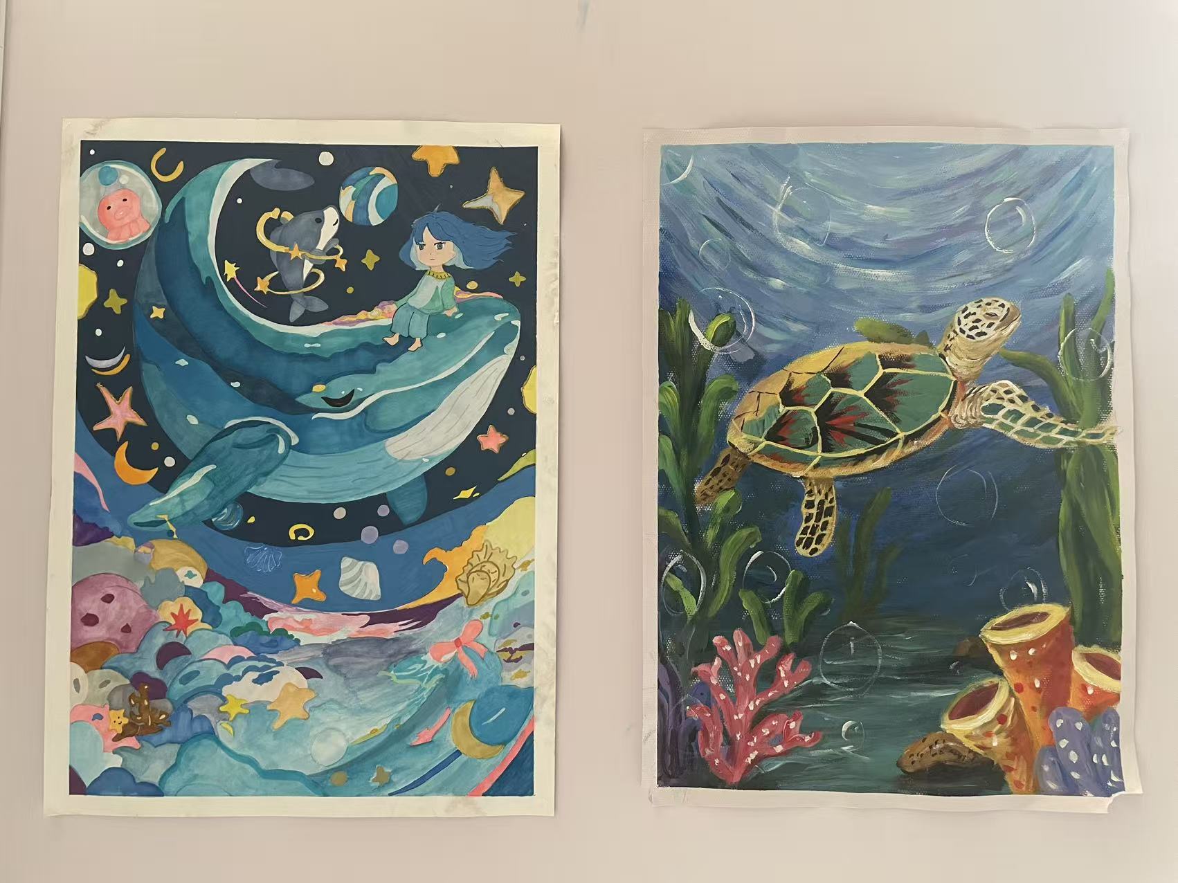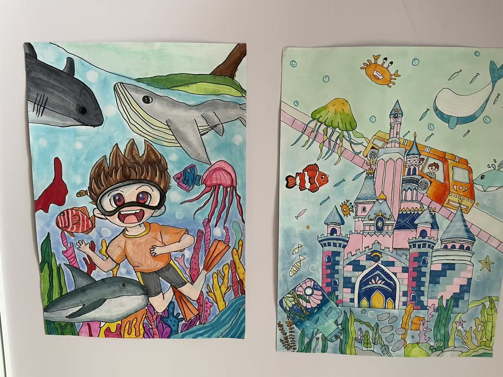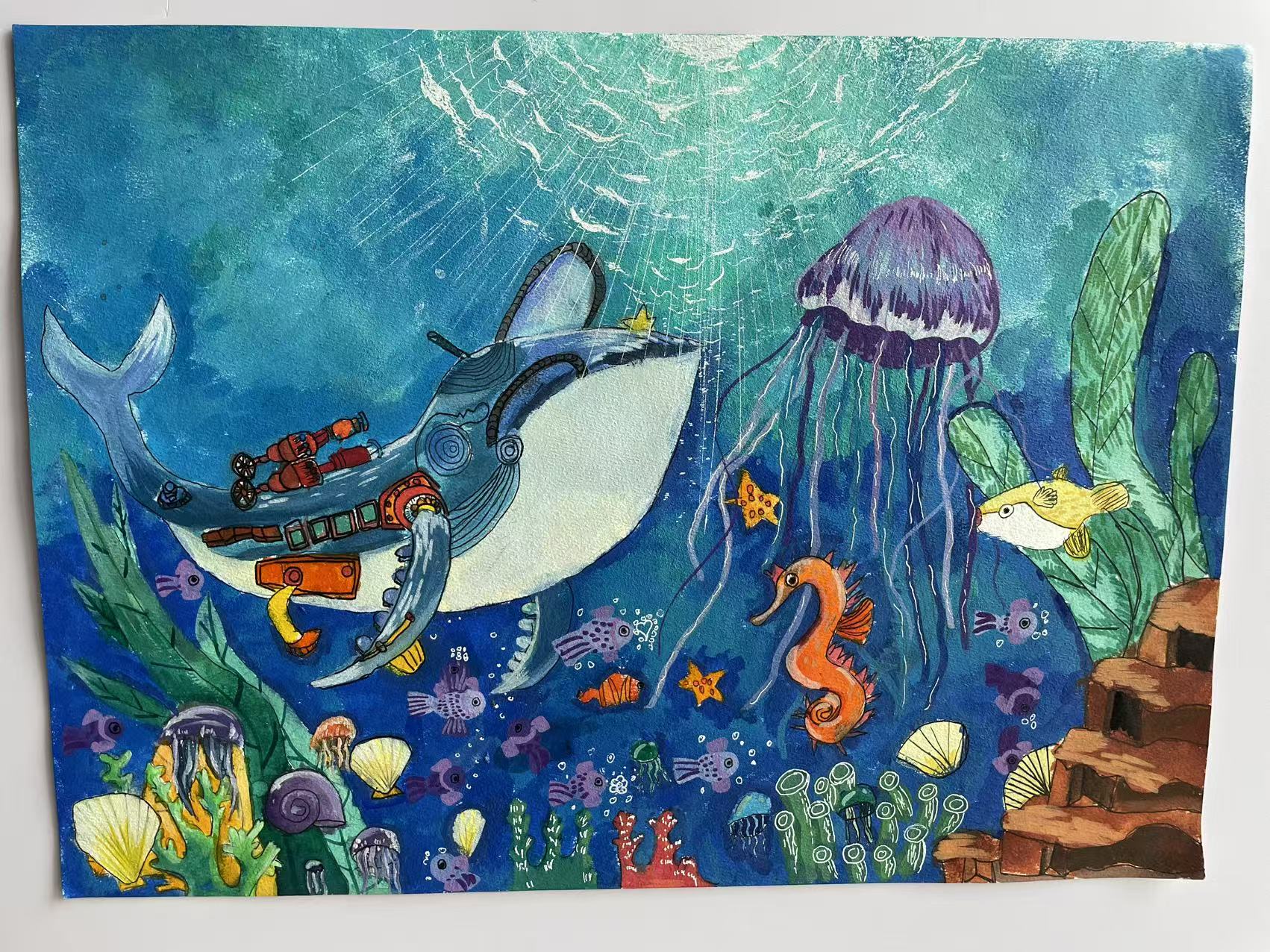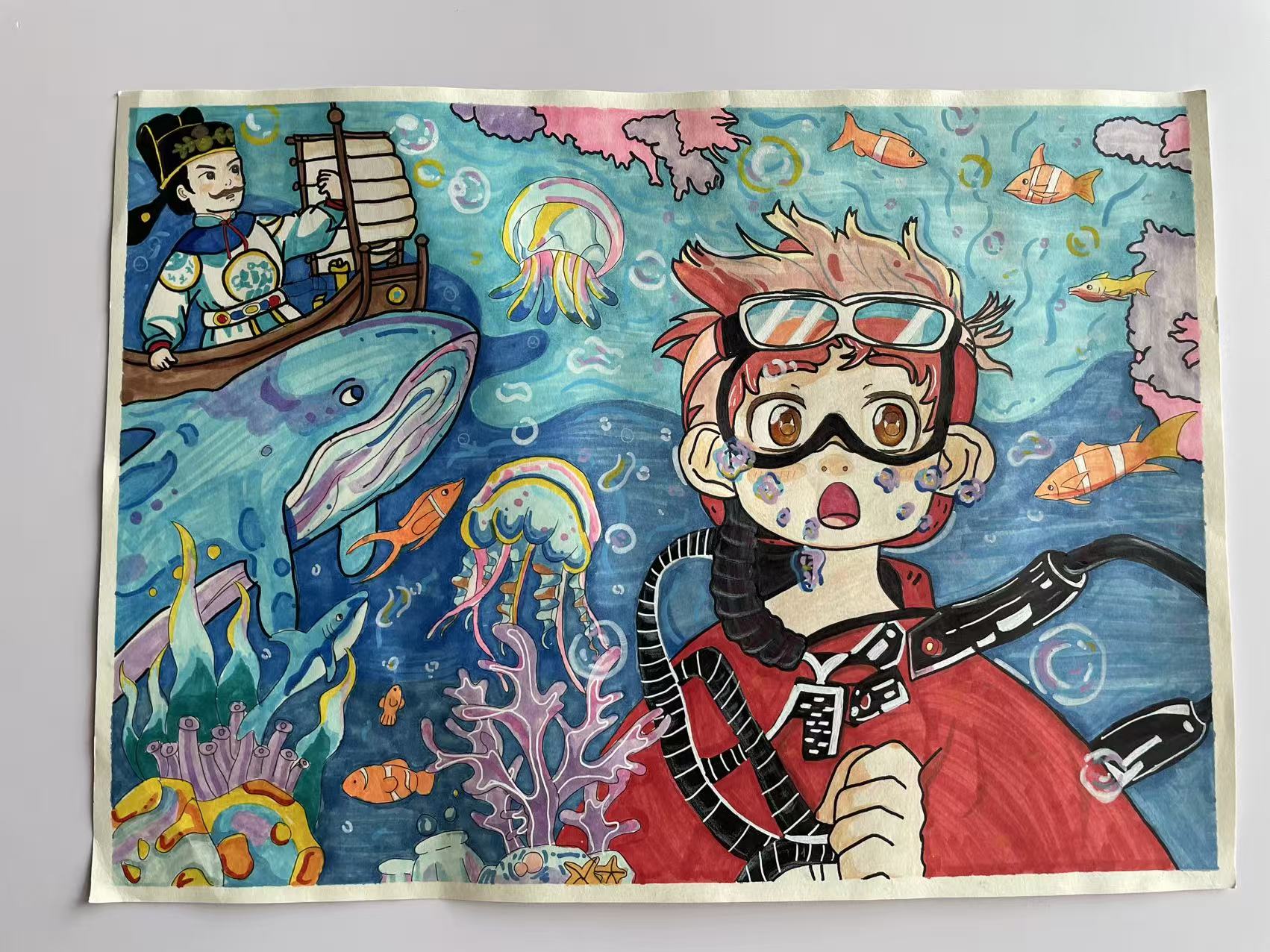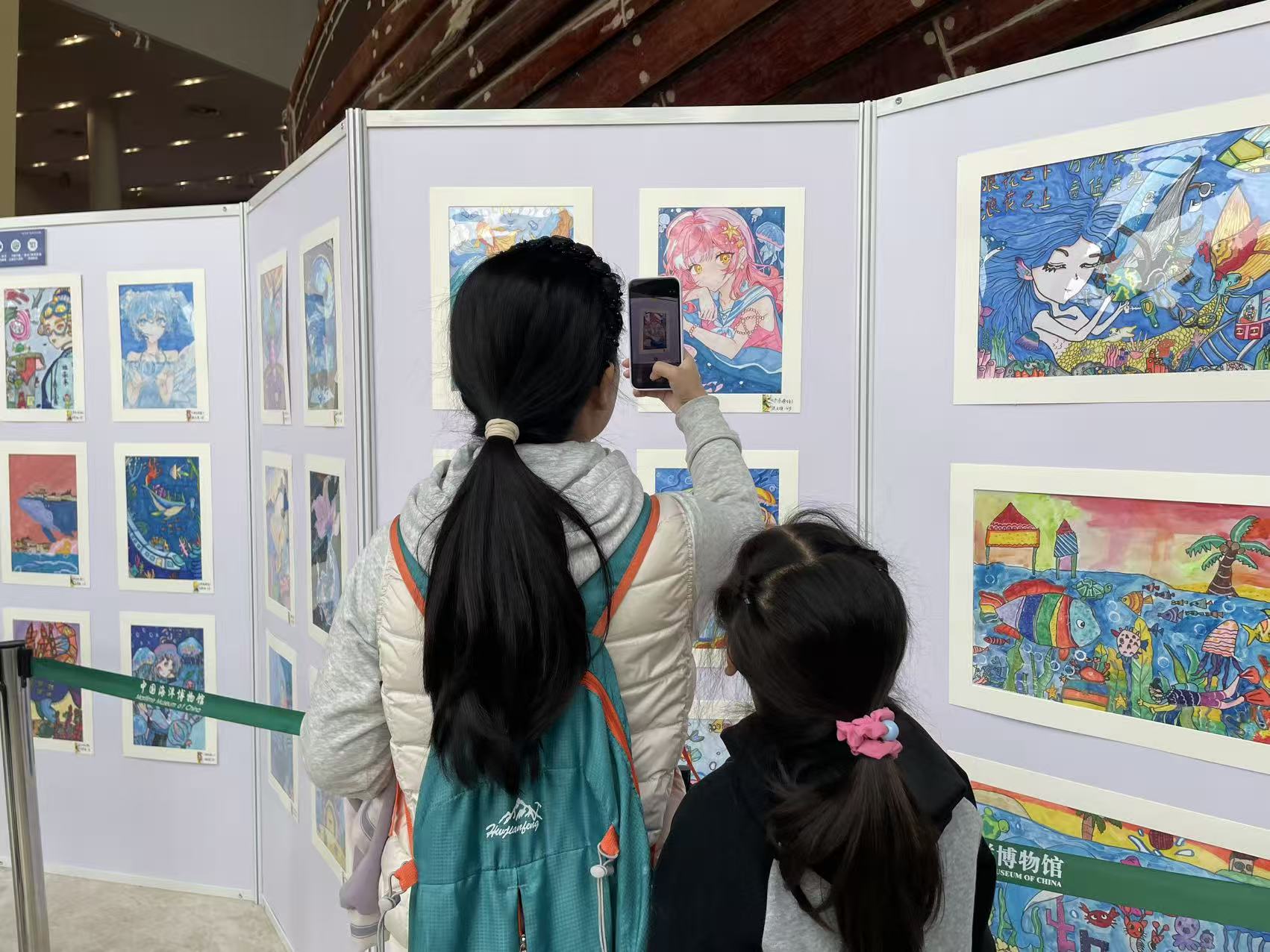 “我的作品写实、写意兼具,既有国家海洋博物馆元素,也有海底的各种生物,希望能把我自己眼中海洋的烂漫世界展示给大家。”获得绘画类初中组一等奖的徐鲁靖悦告诉记者。