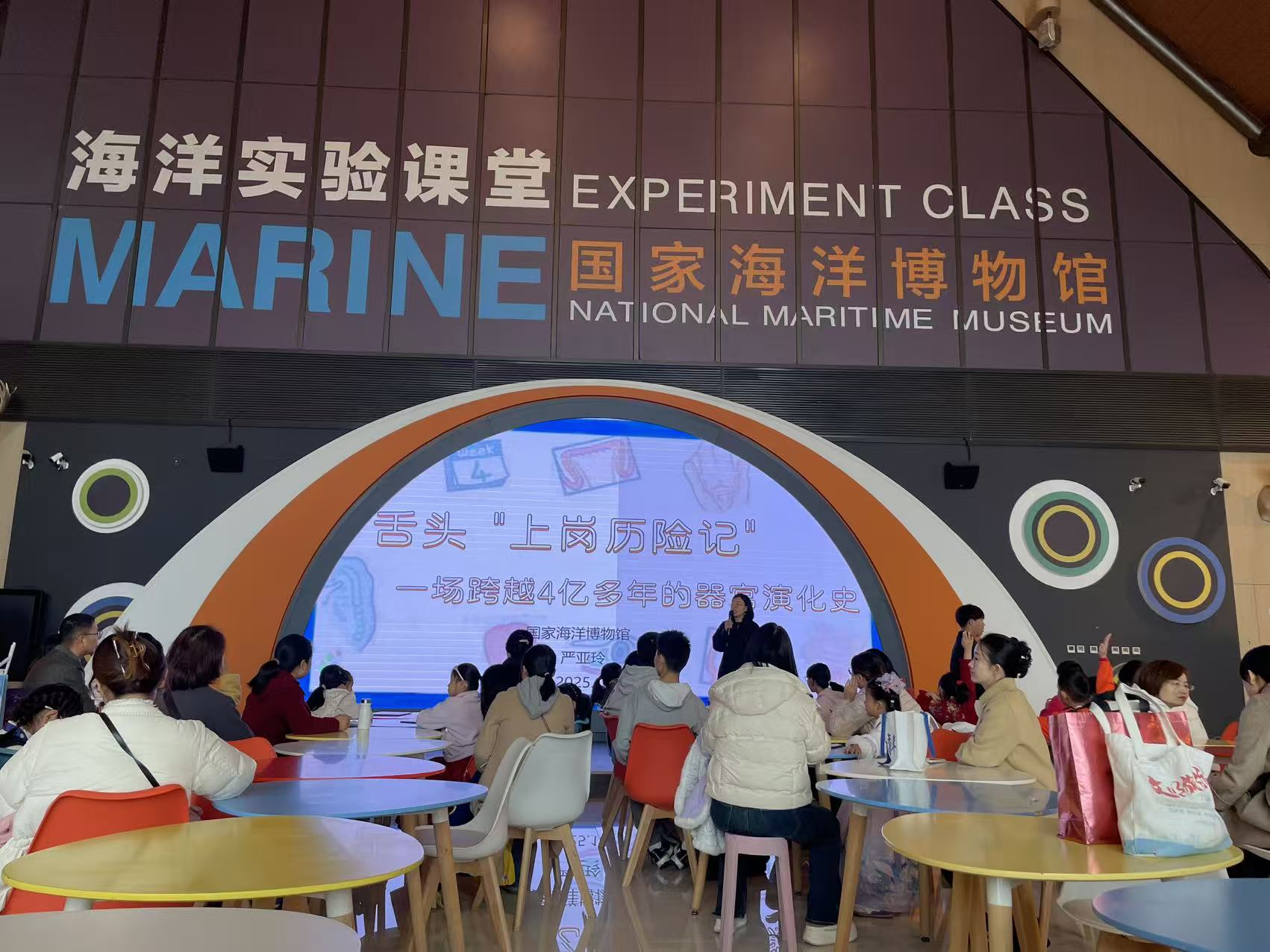25日下午,题为《舌头“上岗历险记”——一场跨越4亿多年的器官演化史》海洋科普公益讲座举办。国家海洋博物馆科研科普中心严亚玲博士以“海洋生物的‘舌头’”为切入点,结合3D动画演示与馆藏实物标本,将抽象的演化生物学知识转化为妙趣横生的故事,向孩子们讲授海洋知识,科普海洋秘密。