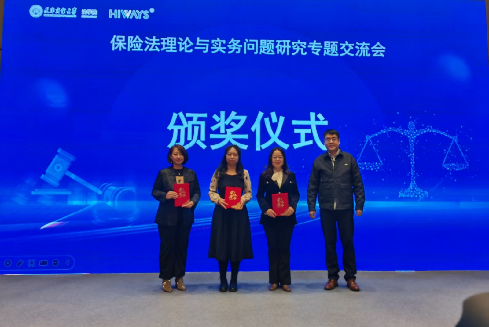 活动期间,与会领导和嘉宾为保险法理论与实务问题研究专题交流会征文活动获奖代表颁发证书,这些论文的获奖作者包括从事法学研究的专家、学者,也有从事法律实务工作的法官、律师,还有在校学生。