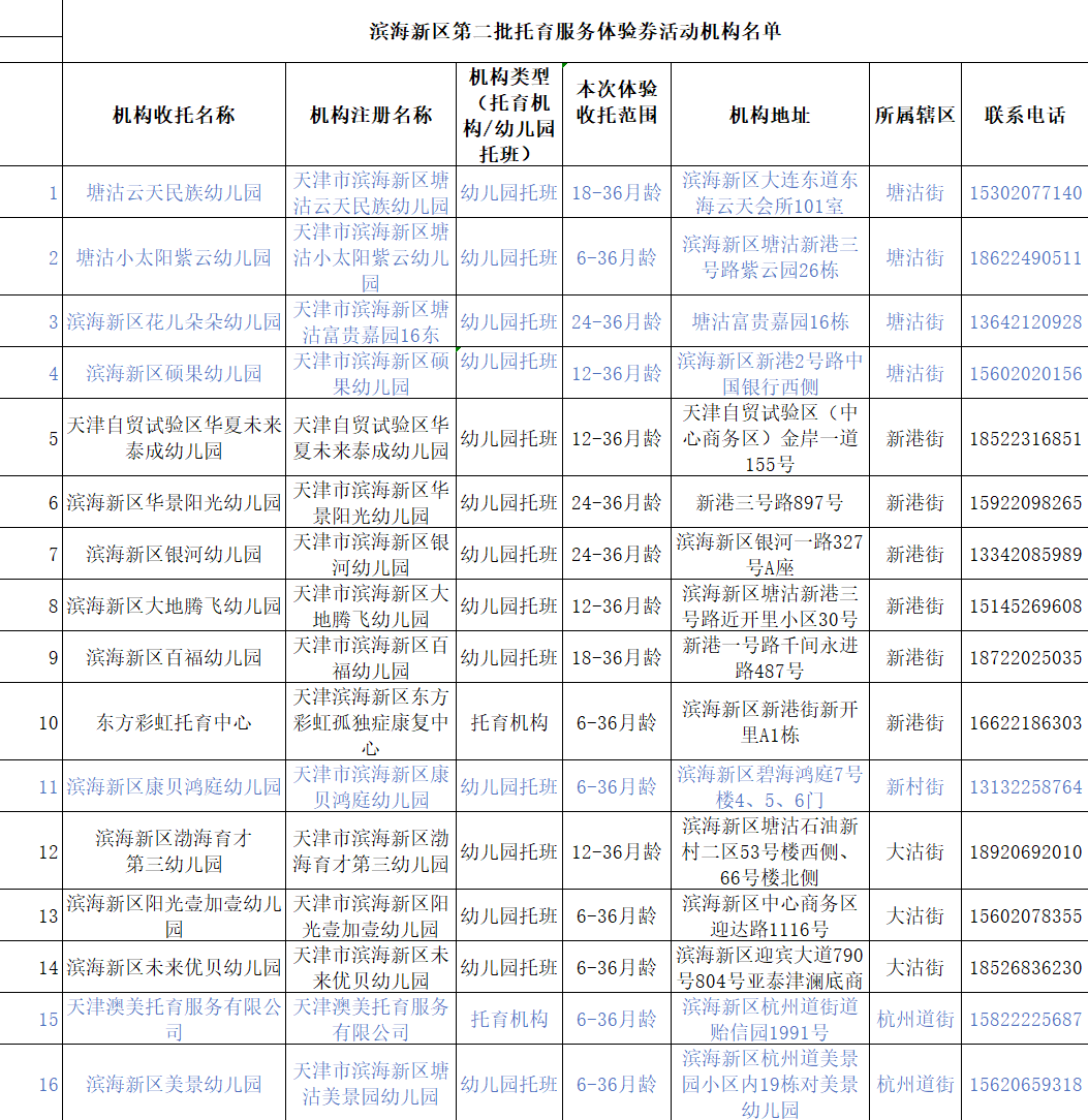 本次滨海新区托育服务体验券发放对象为有托育需求且未在新区入托的6-36月龄婴幼儿家庭,符合条件的婴幼儿家长可以就近选择意向托育机构预约申领并预约体验。每个参与体验活动的婴幼儿最多可以申领2张,单张体验券可以根据预约时间到机构免费体验1日全日托服务。