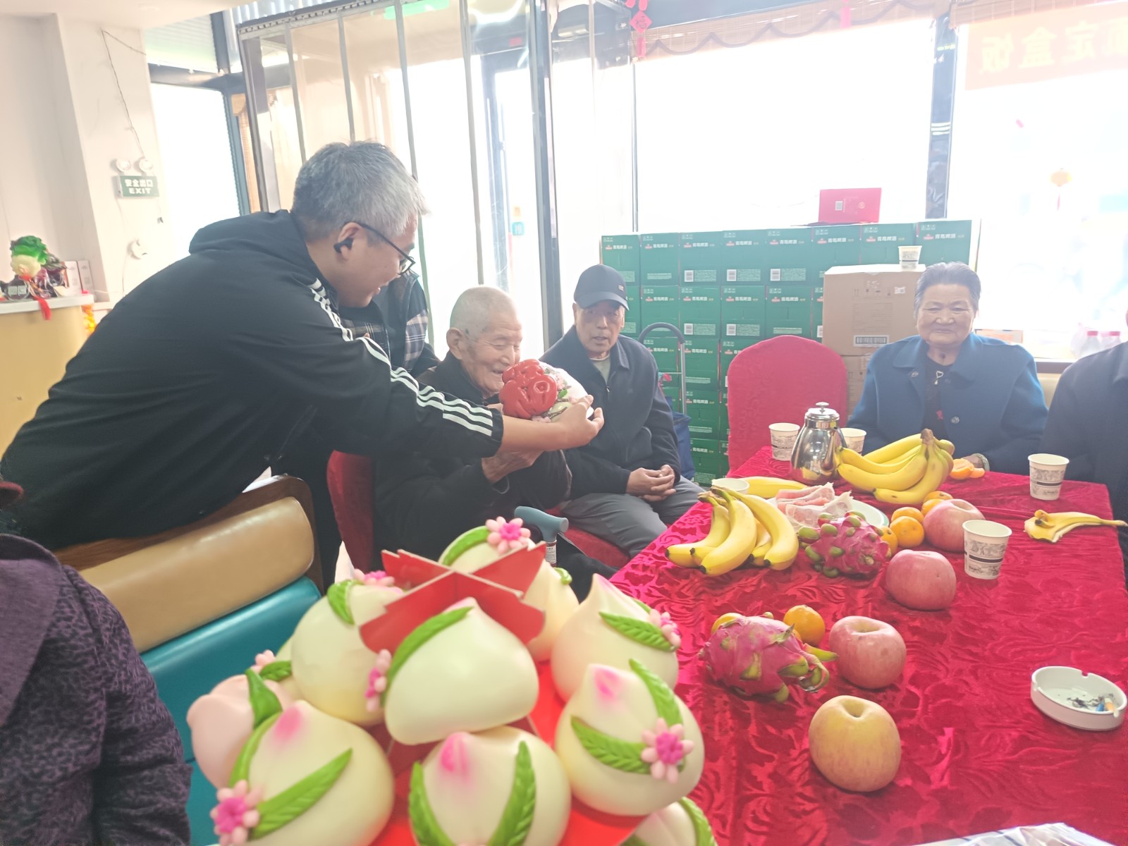活动现场暖意融融,鲜红的“寿”字映照着老人们欢喜的脸庞。工作人员提前备好柔软座椅、水果、热水和寿桃,老人们在子女搀扶下陆续到场,工作人员的贴心问候让大家倍感亲切。“村里总是请我们老年人聚会,真是太热闹了!”95岁的老爷爷感慨道。老人们围坐畅谈,分享人生故事、哼唱经典歌曲,现场掌声与笑声不断。