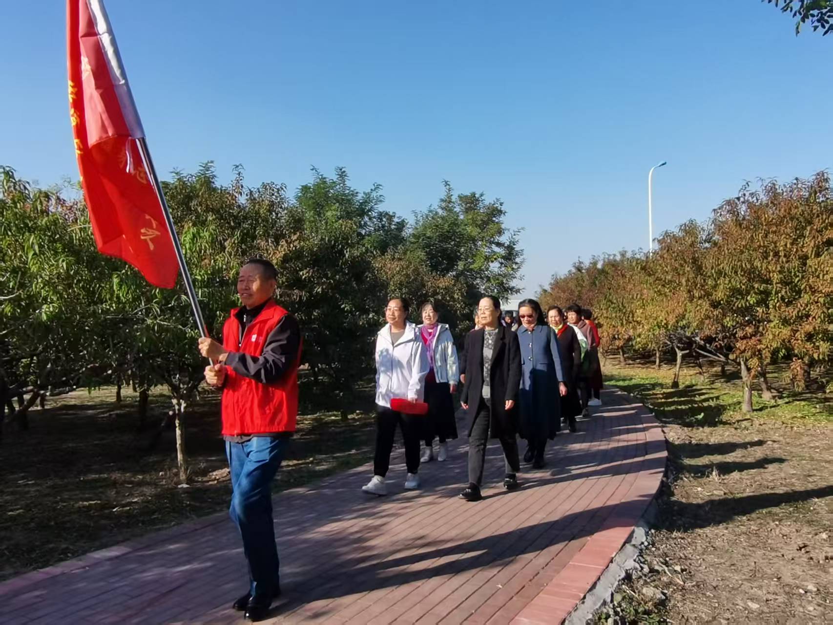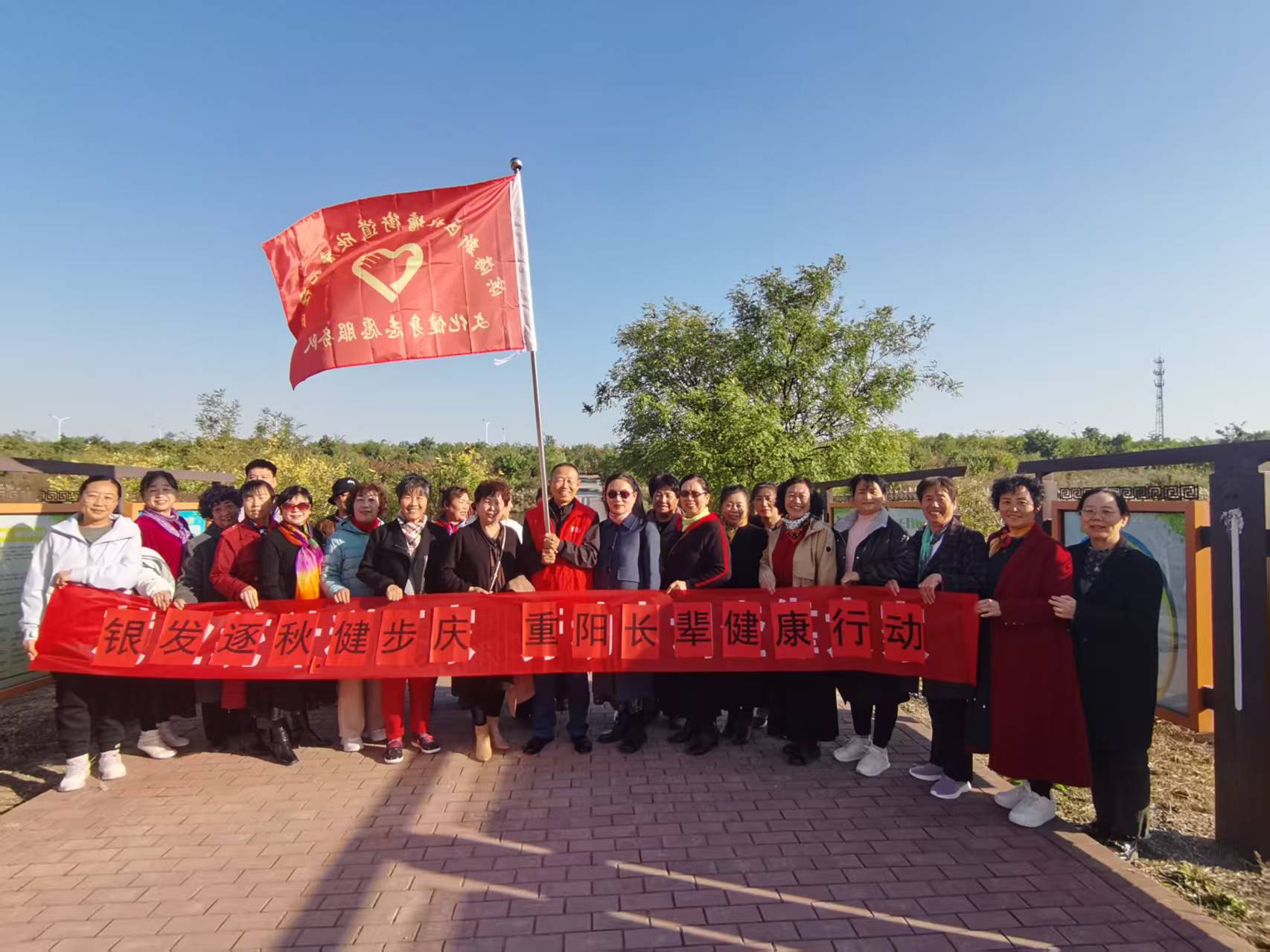 活动伊始,社区工作人员引导参与活动的老年居民有序集合、排队组队。随着出发指令发出,老人们迈着整齐的步伐开启健步之旅,一边欣赏沿途秋景,一边畅谈生活趣事,气氛轻松愉悦。最终,队伍顺利抵达目的地郊野公园,工作人员组织全体长辈拍摄大合照,定格下这一温馨欢乐的瞬间。
