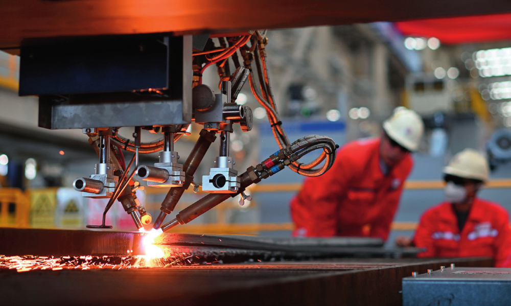工作人员在海油工程天津智能制 造基地制管作业车间调试数控切板机(2024年10月10日摄) 赵子硕摄 / 《瞭望》