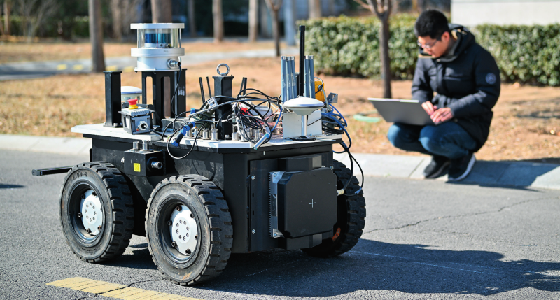 工程师在京津中关村科技城道路上 对一款防爆轮式巡检机器人进行路测调试(2025年2月20日摄) 孙凡越摄 / 《瞭望》