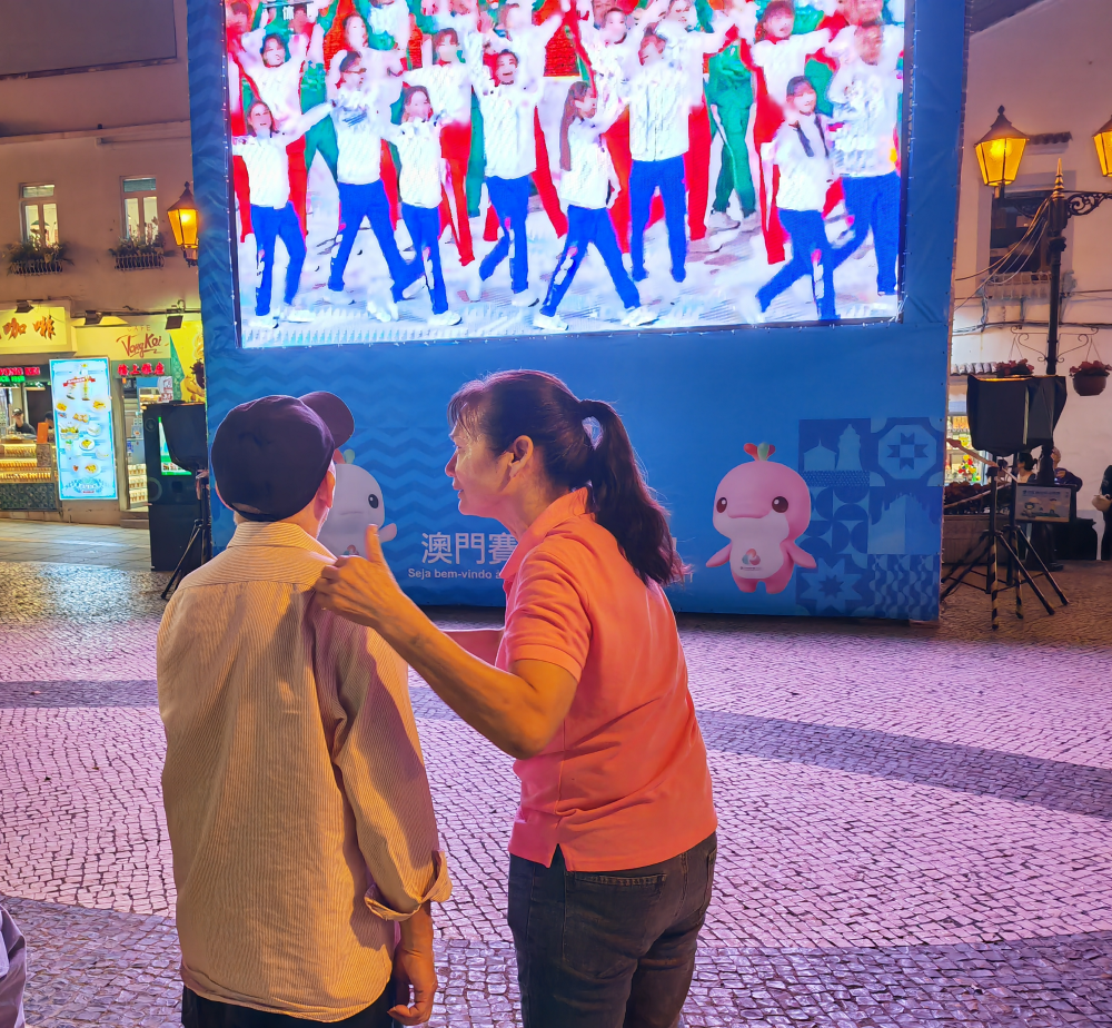 第十五届全运会开幕前几天,店门口的小广场上竖起了一块巨大的电子屏,这是澳门特区政府为十五运会设置的公共观赛点。过去这个时间,官也街还静悄悄的,如今却已有早起的游客在屏幕前驻足。