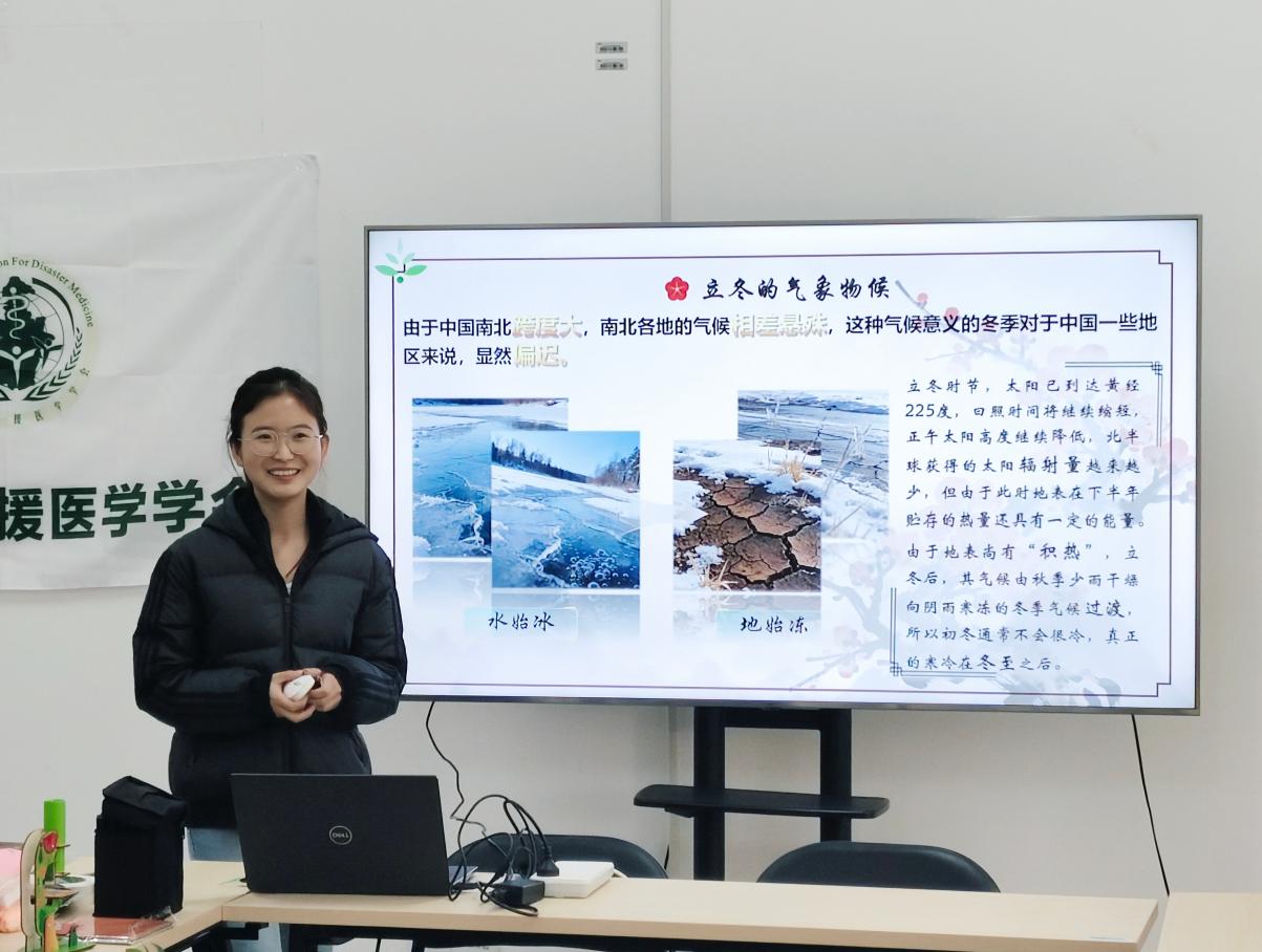 活动以第十九个节气立冬为契机,围绕“节气文化为脉,乳食健康为核”展开。活动伊始,天津科技大学青蒲青年志愿者协会宣讲团成员、经开区蓝天救援队志愿者张若涵,系统地进行了立冬知识的趣味科普:从“立冬是二十四节气的第十九位、太阳到达黄经225°”的天文定义,到饱含“万物藏敛节气哲学”的历史渊源,再到以“水始冰、地始冻、雉入大水为蜃”的物候特征,张若涵用生动的语言描绘出冬季来临的自然景象,深入解析古代帝王“迎冬礼”的礼节文化,让青少年感受到节气背后的厚重历史。