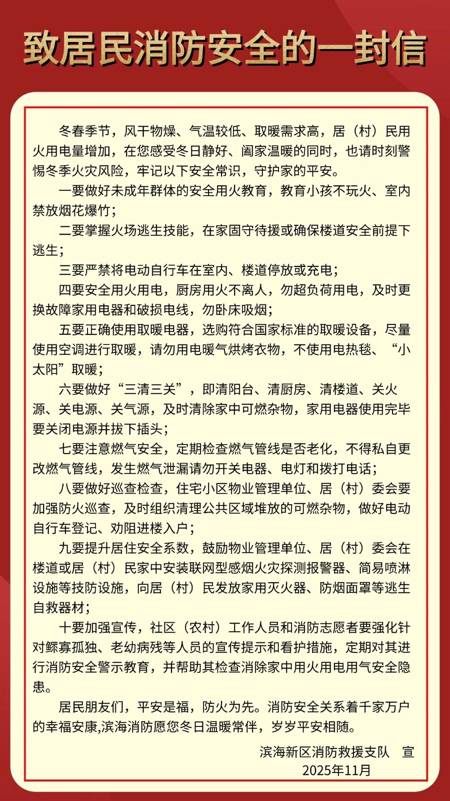 居民朋友们,平安是福,防火为先。消防安全关系着千家万户的幸福安康,滨海消防愿您冬日温暖常伴,岁岁平安相随。