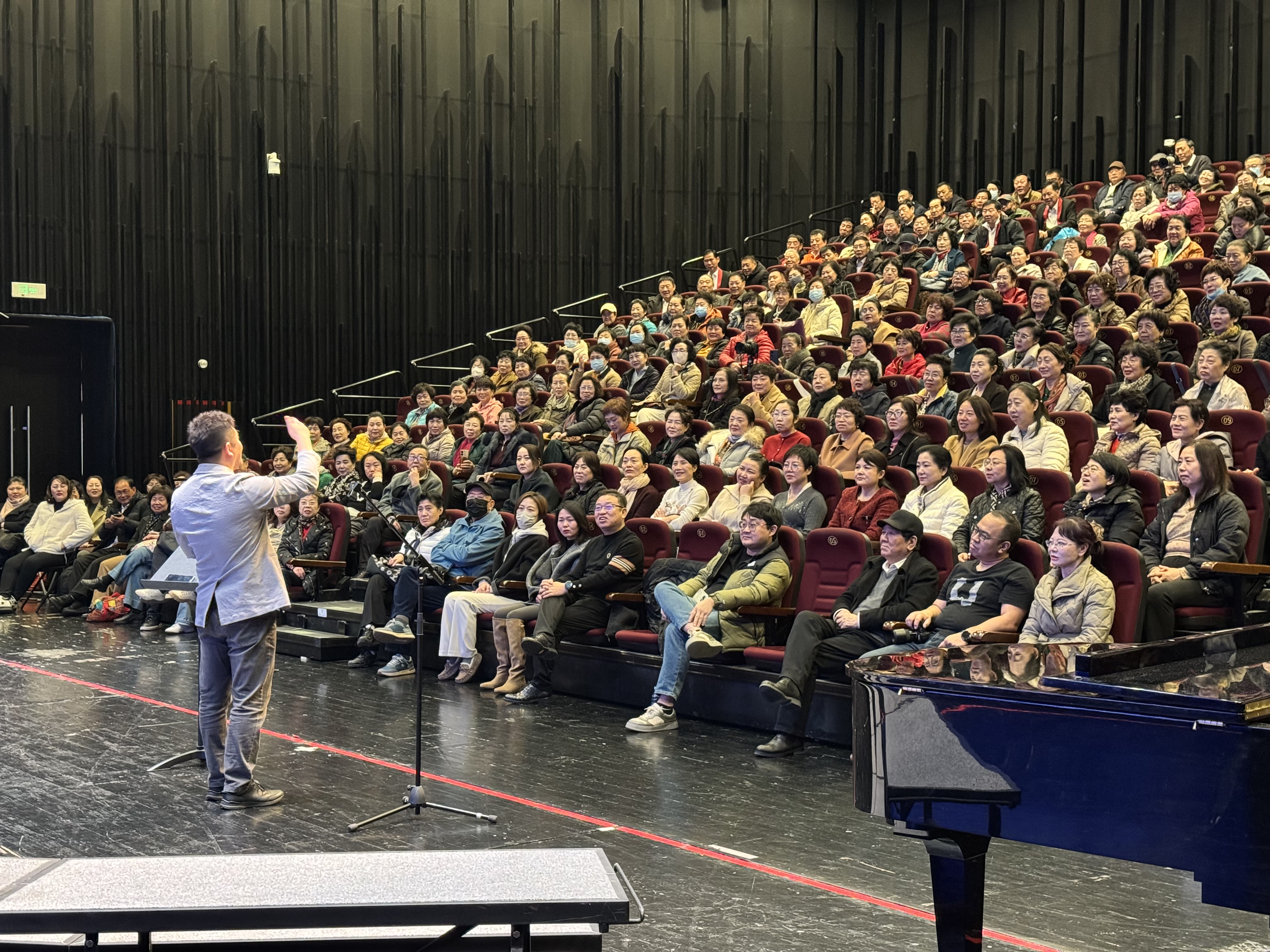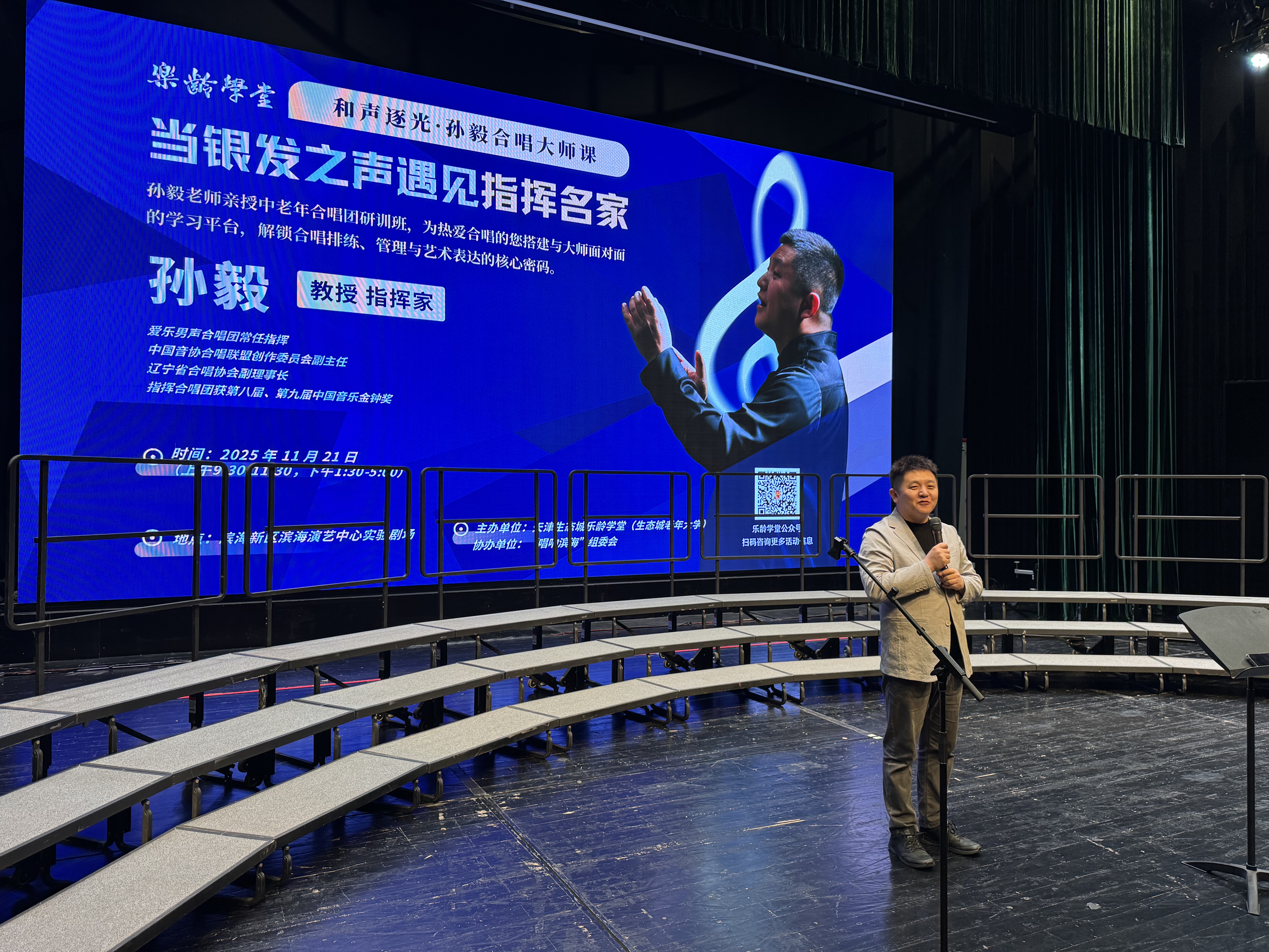 津滨网讯(记者 张伯妍 摄影报道)11月21日,天津滨海新区滨海演艺中心实验剧场内歌声悠扬、暖意融融,专为滨海新区中老年合唱爱好者量身打造的《和声逐光・孙毅合唱大师课》在这里圆满举行。中国爱乐男声合唱团常任指挥孙毅教授亲临授课,以专业实用的教学内容为滨城合唱事业注入新活力,让现场百余位中老年合唱爱好者在和声中感受艺术魅力。