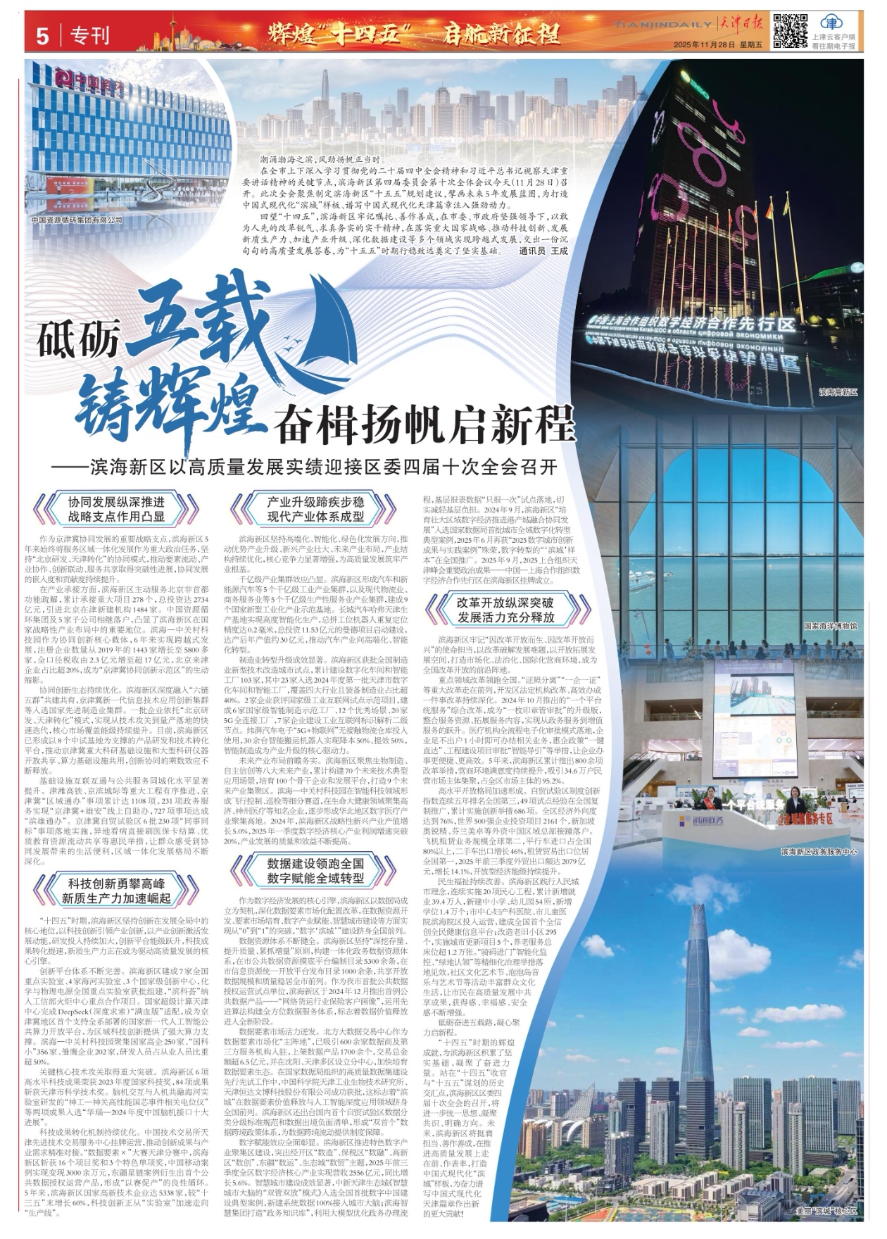 “十四五”时期,滨海新区坚持创新在发展全局中的核心地位,以科技创新引领产业创新,以产业创新激活发展动能,研发投入持续加大,创新平台能级跃升,科技成果转化提速,新质生产力正在成为驱动高质量发展的核心引擎。