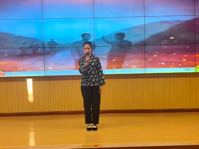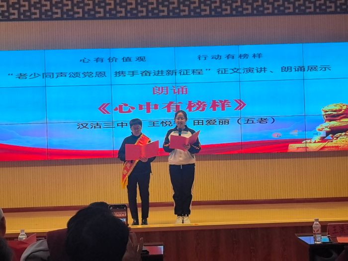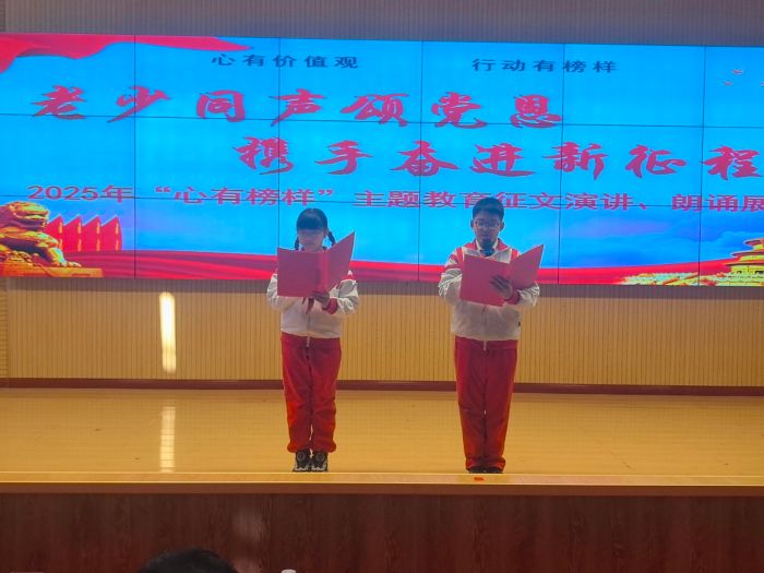 现场展示的征文演讲、朗诵作品,是今年滨海新区北部区域 32 所中小学、幼儿园、特殊教育学校在初赛基础上推荐,再经 3 场复赛选拔出的代表作品。展示现场气氛热烈,高潮迭起。白发苍苍的老党员与朝气蓬勃的青年学子同台,退休教师与少先队员携手,以声传情,以诵抒怀。从“五老”与少年的红色传承,到幼儿园的文明萌动,从启智学校的《星灯领航》,到中学课本剧的历史再现,每段演绎都是一次精神洗礼,不仅展现了青少年对“心有榜样”的理解,更让大家读懂了榜样是旗帜,更是前行力量。今天的精神滋养,化作“从小做起”的行动,以榜样为镜,向榜样学习。