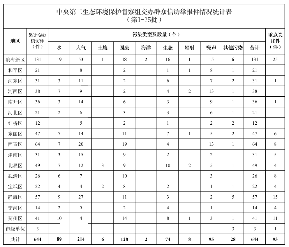 12月4日,中央第二生态环境保护督察组向我市交办第十五批群众信访举报件71件(重点关注件14件)。其中,来电44件、来信27件。本批信访举报件涉及滨海新区18件、和平区1件、河东区2件、河西区6件、南开区8件、河北区3件、东丽区5件、西青区3件、津南区4件、北辰区5件、武清区3件、宝坻区1件、静海区6件、宁河区3件、蓟州区3件。