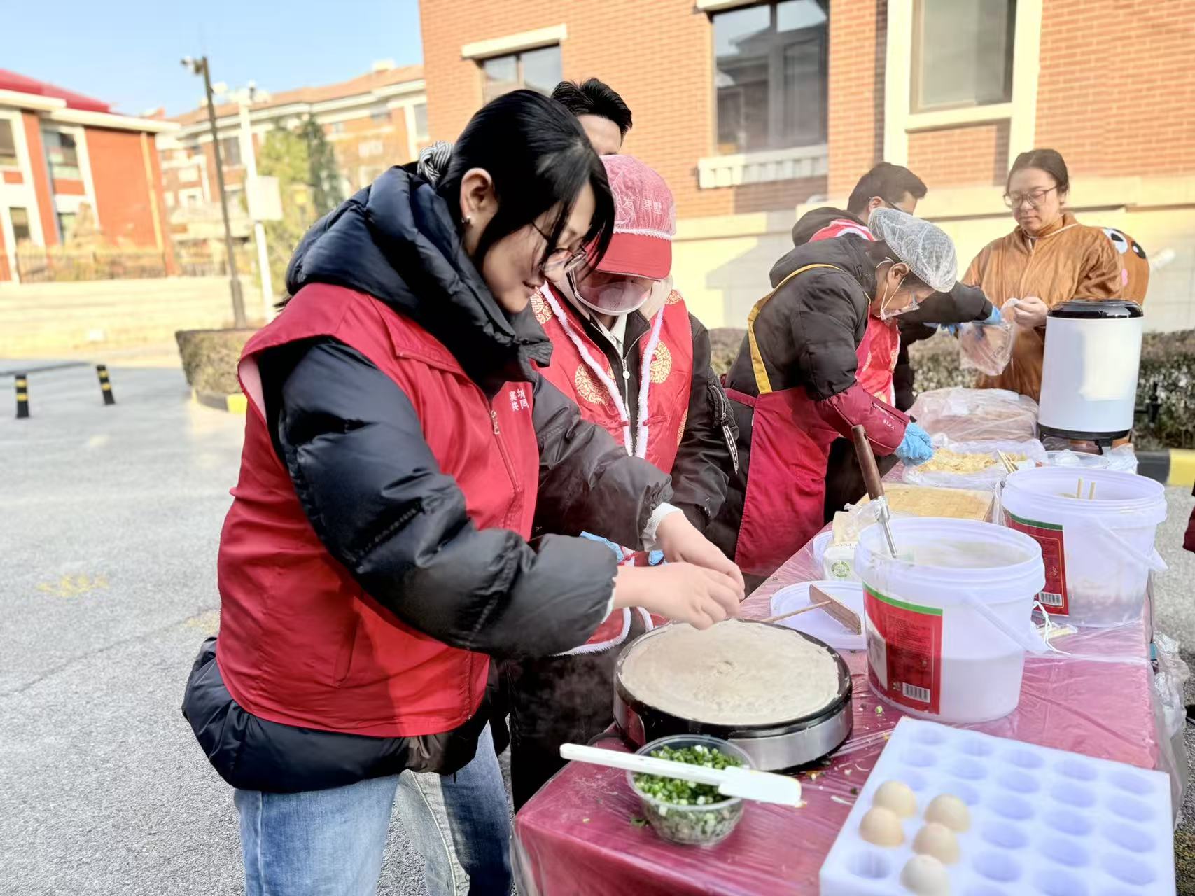 活动现场氛围热烈融洽,社区志愿者与物业工作人员分工协作、默契配合,有条不紊地开展煎饼馃子制作工作。摊面、打鸡蛋、撒葱花、抹酱料、加薄脆,一系列动作娴熟流畅,新鲜出炉的煎饼馃子香气四溢,瞬间吸引众多居民驻足排队。大家有序等候领取美食,脸上满是期待与笑意,拿到热气腾腾的煎饼馃子后细细品尝,口感地道、暖意暖心,现场不时传来阵阵称赞,邻里间闲话家常,烟火气息十足,尽显和谐融洽。