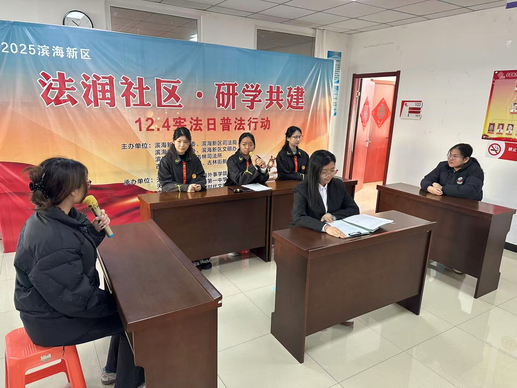 在随后举办的法治文艺汇演中,天津外国语大学滨海外事学院法学系的学生们带来了模拟法庭情景剧《邻里纠纷依法解》、演讲《让法律走进生活》等节目,通过贴近百姓生活的事例,宣传和普及法律知识,让大家直观感受法律的正义与威严,以及如何运用法律维护自身合法权益。