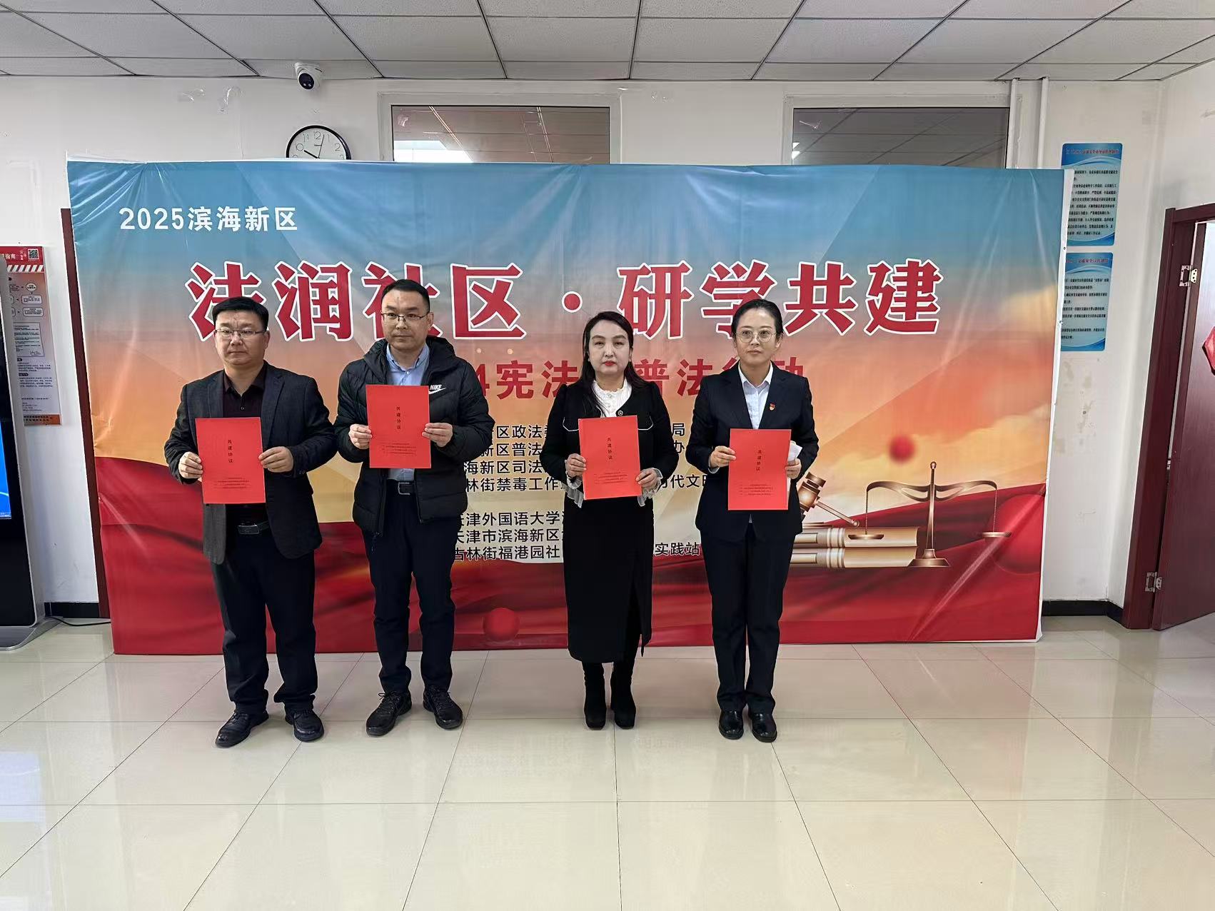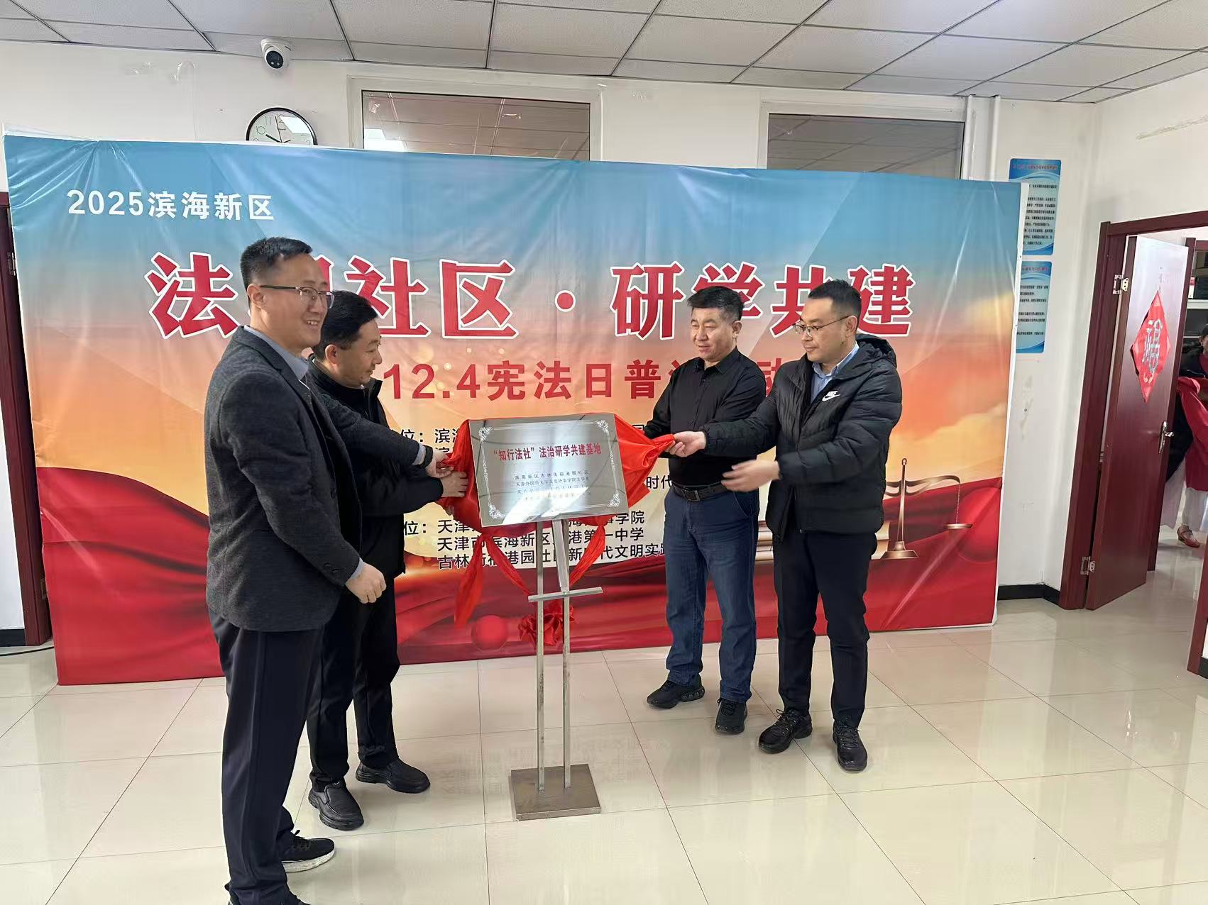 津滨网讯(记者 董欣 窦树泽 摄影报道)在2025年“宪法宣传周”期间,滨海新区司法局古林司法所、古林街道福港园社区、大港第一中学、天津外国语大学滨海外事学院法学系联合举办“法润社区·研学共建”宪法宣传主题活动,由四方合作共建的“知行法社”法治研学共建基地揭牌。