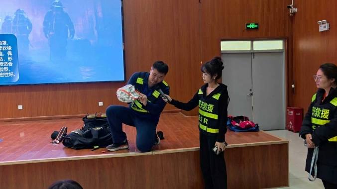 在消防装备展示与体验环节,救援队带来了全套个人防护装备、破拆工具组、红外热成像仪、正压式空气呼吸器等专业设备。队员们逐一讲解其功能用途,并邀请多名学生上台试穿厚重的消防战斗服、佩戴头盔和空气瓶。一位参与体验的学生感慨道:“才穿了几分钟就感觉喘不过气,太重了!真的特别佩服消防员叔叔们能在这样的条件下救人。”这一沉浸式体验让学生们深刻体会到消防工作的艰辛与伟大,也进一步激发了他们尊重职业、敬畏生命的意识。
