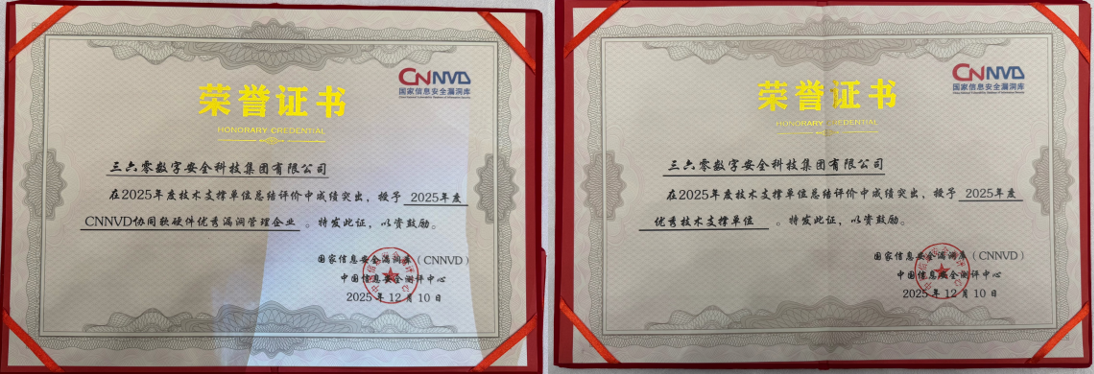 在本次大会网络漏洞治理生态分论坛上,三六零数字安全科技集团有限公司获颁由国家信息安全漏洞库(CNNVD)与中国信息安全测评中心授予的两项重要荣誉:“2025年度优秀技术支撑单位”及“CNNVD协同软硬件优秀漏洞管理企业”,体现了其在国家漏洞治理生态中的突出贡献与技术支撑能力。