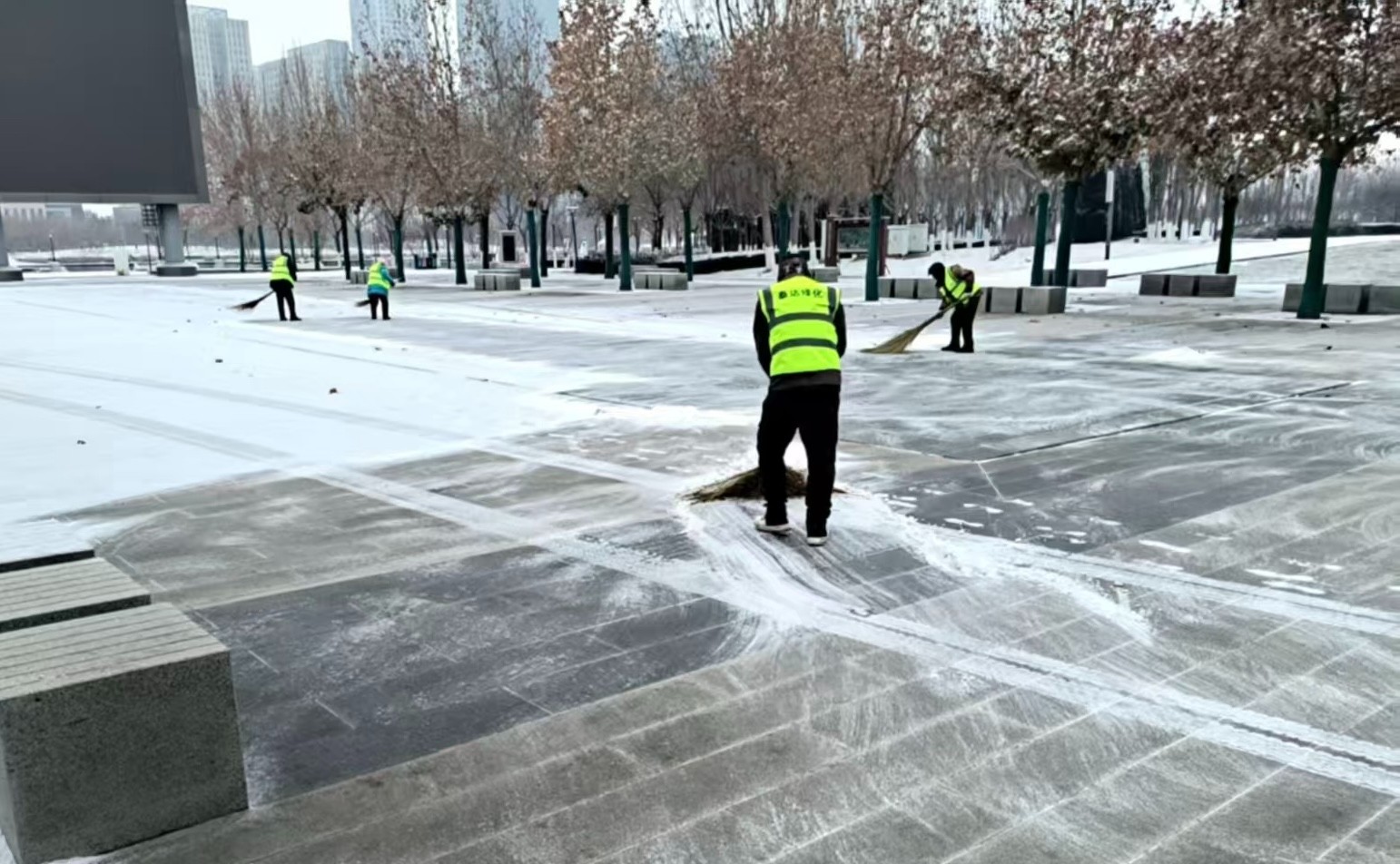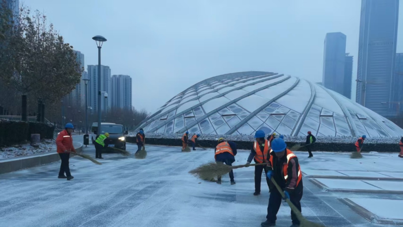 目前,天津经开区的清雪工作已延伸至人行道等区域。全区组织环卫绿化专业人员889人次,并发动社会力量70余人共同参与,针对高铁站广场、重点区域人行道进行集中清扫。目前,上述区域积雪已基本清理完毕。