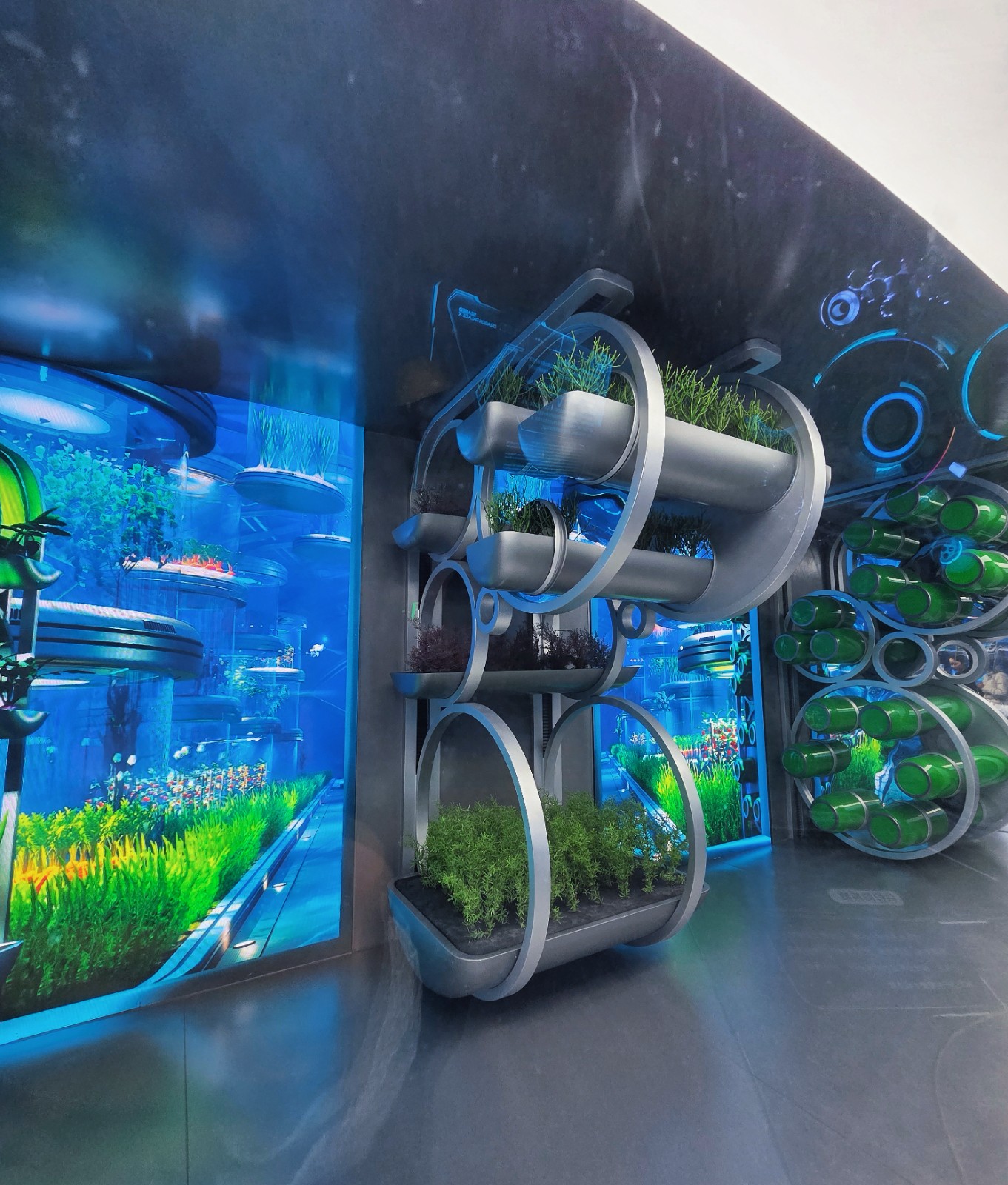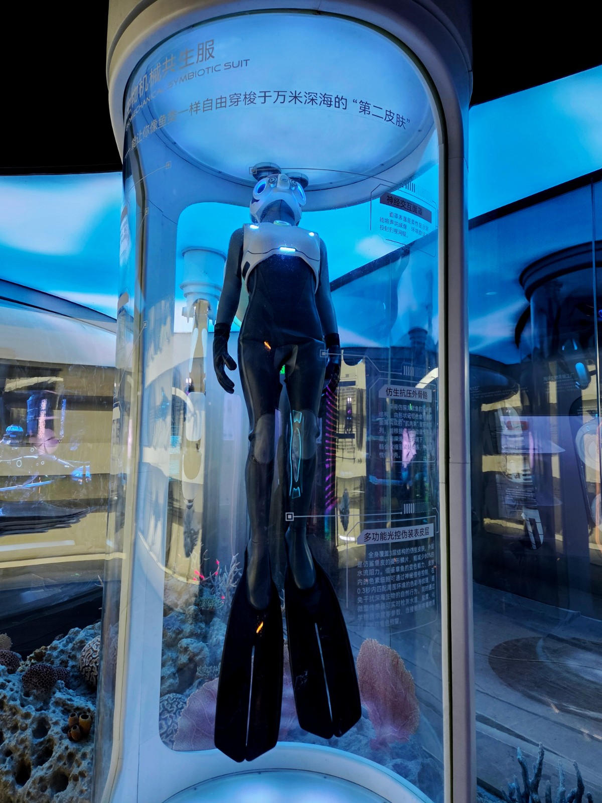 党的二十届四中全会审议通过的相关规划建议,明确提出“加强海洋开发利用保护,坚持陆海统筹,提高经略海洋能力,推动海洋经济高质量发展,加快建设海洋强国”,为基层工作提供根本遵循。这场以“预见、探索、共生”为内核的展厅升级,正是海博馆将全会精神转化为具体实践的鲜活尝试。海洋,是地球的蓝色动脉,更是人类可持续发展的战略空间。1700平方米的“未来海洋”展厅里,蓝色主色调铺满整个空间。以“一场未来海洋的遇见与探索”为核心,深蓝的召唤、海洋时空切片、深海下潜舱等八大主题场景依次铺展,以“时间链条”与“科技维度”为双轨,构建出跨越时空的蓝色对话场。不同于传统静态陈列,展厅深度融合数字孪生、AI交互等前沿技术,让观众从“旁观者”变身“参与者”——深海空间站可体验定制化深海职业场景;生态实验舱能参与珊瑚基因修复;海底温室培育舱的定向深海海藻解决食物供给;再生能源补给舱通过潮汐发电、海水制氢提供永续动力;“智能大脑”总控舱实现全系统高效调度,六大功能区全景呈现人类与深海共生的未来图景。