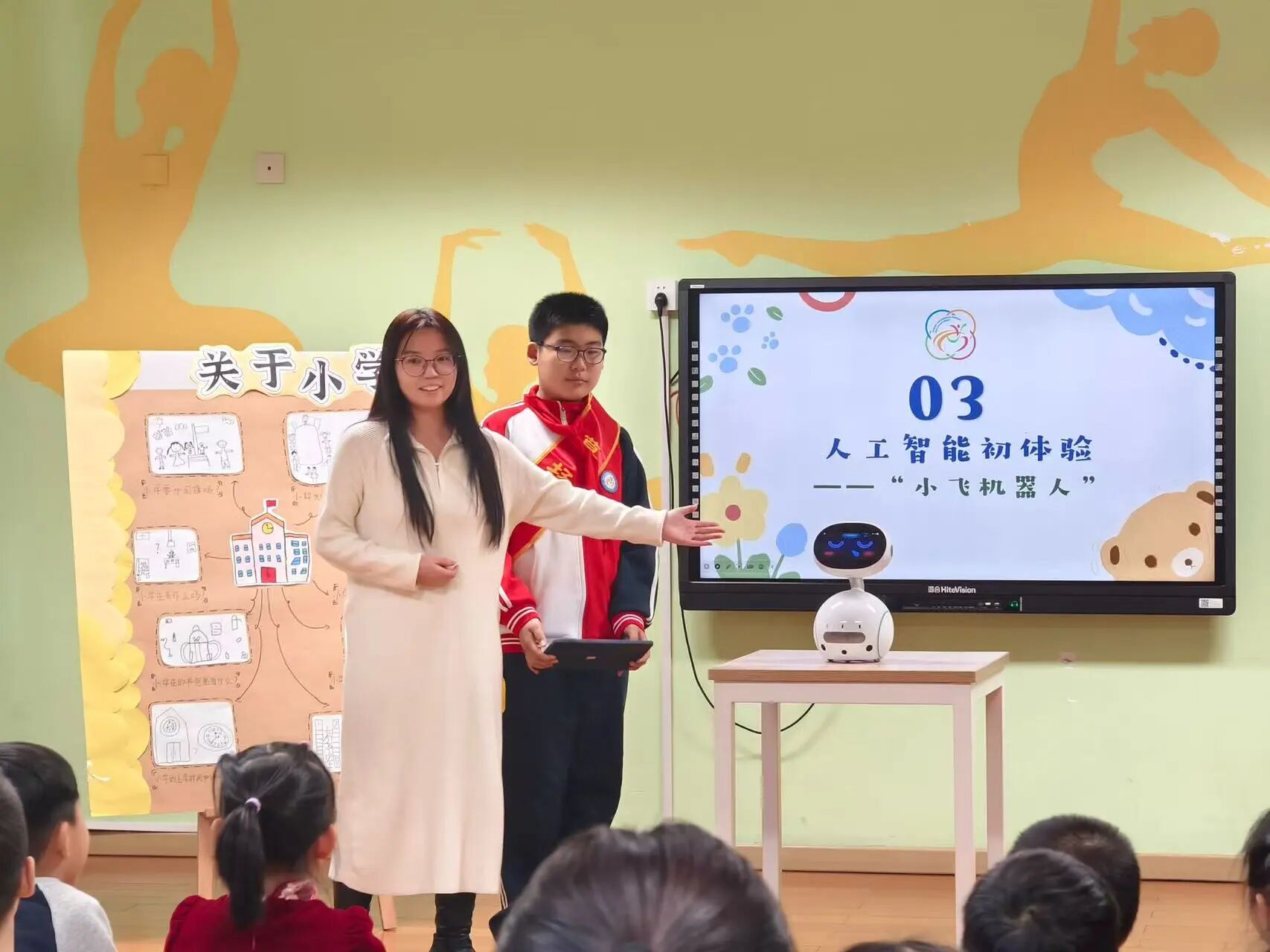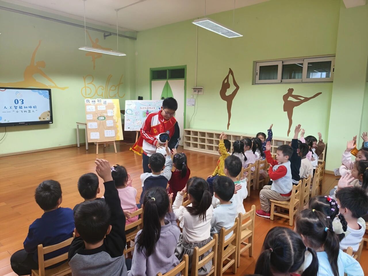 在“人工智能初探”环节中,草场街小学的科学教师王赛老师与六年级学生代表展示了“小飞机器人”,并进行了简单的编程操作演示。幼儿园小朋友近距离接触小飞机器人,亲身体验人工智能的神奇魅力。王老师以“种下科学的种子”为主题,向孩子们介绍了小学丰富有趣的科技课程,鼓励他们保持好奇心,勇于探索未知。